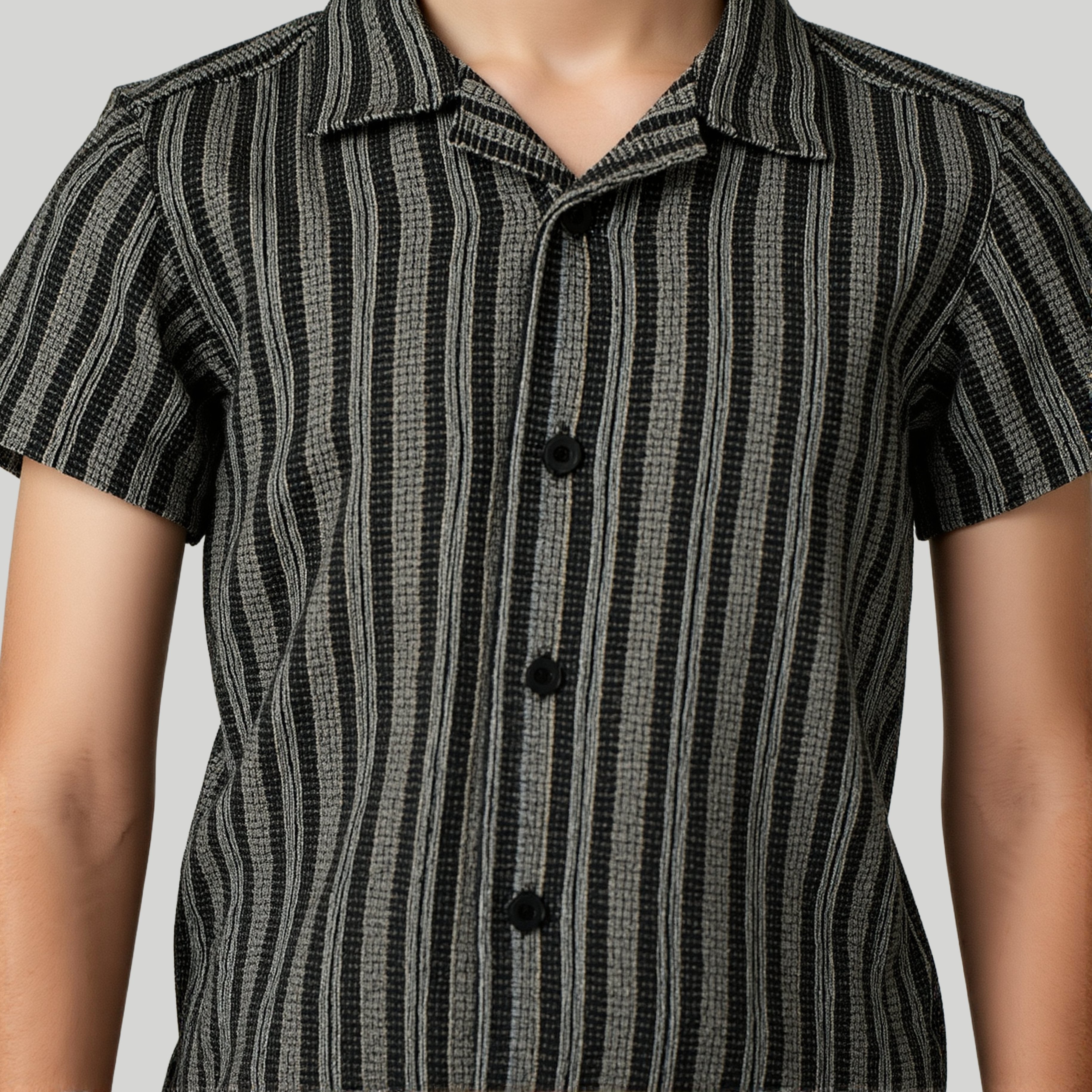 These striped pattern shirt has camp collar and half sleeve. Made from polyester cotton, your kid's feel comfortable wearing the product.