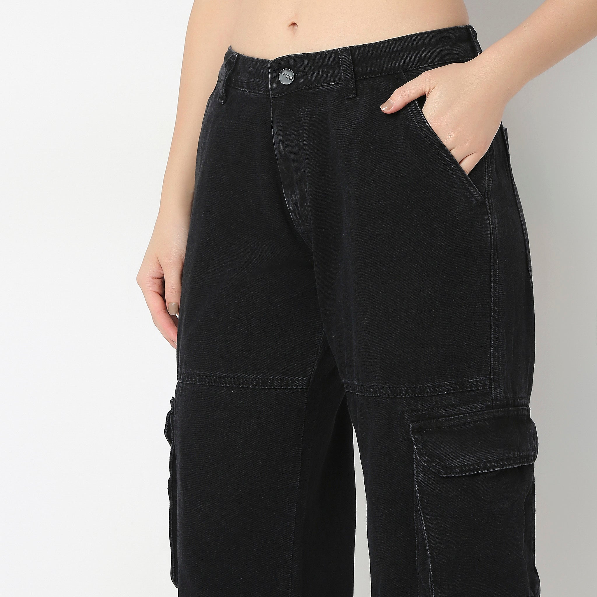 These solid pattern cargo fit jeans has full length, high rise waist. Made from cotton, it is soft and comfortable to wear.