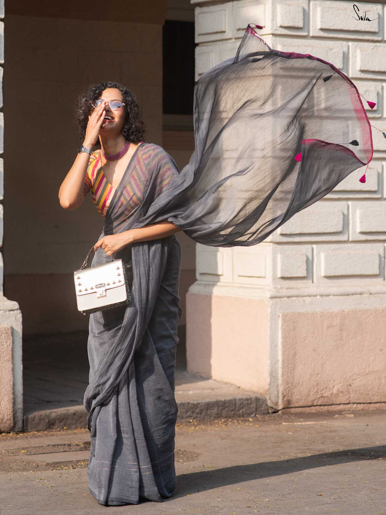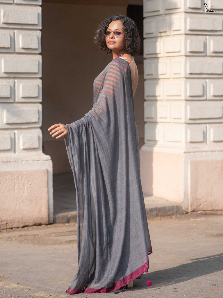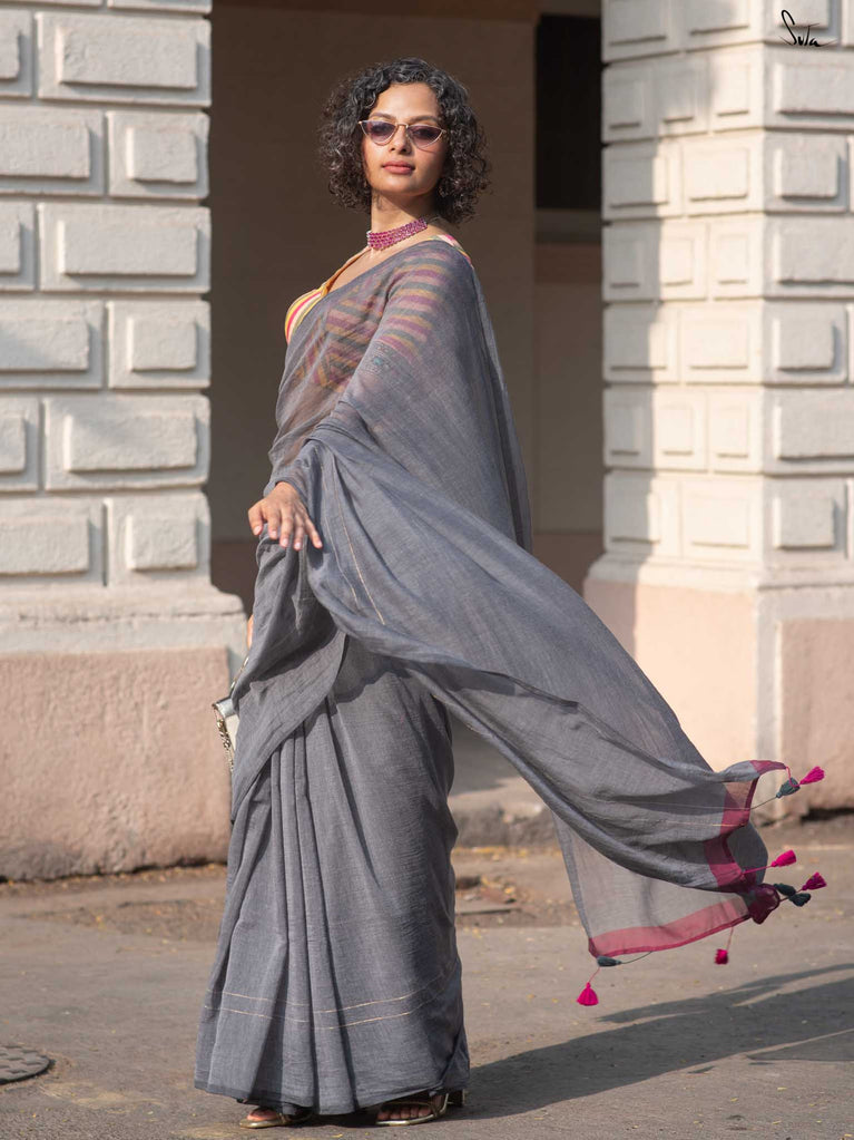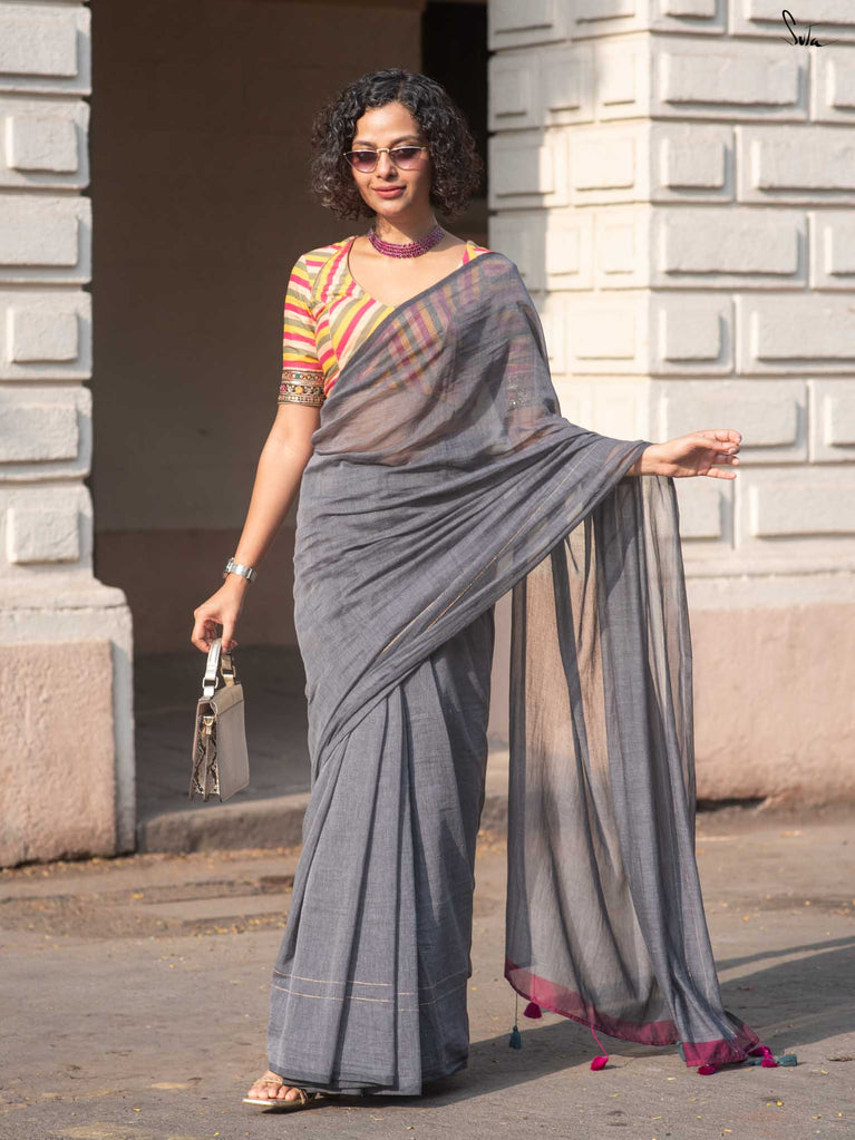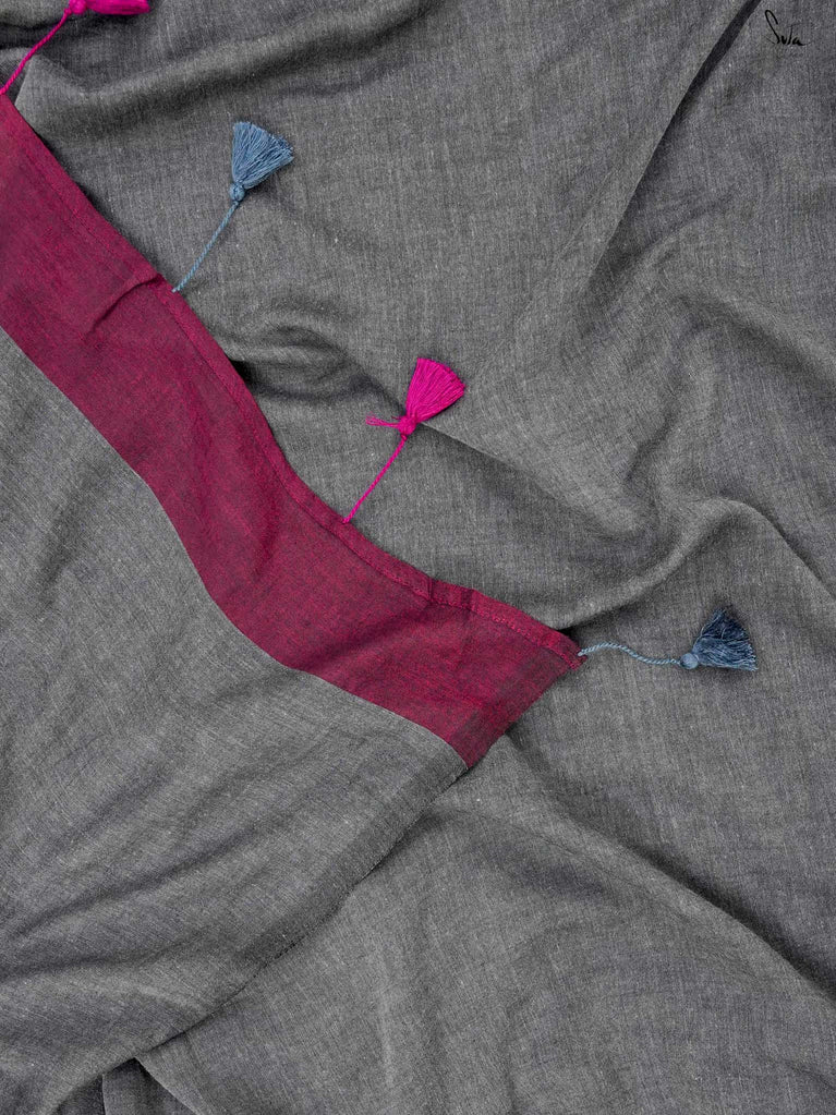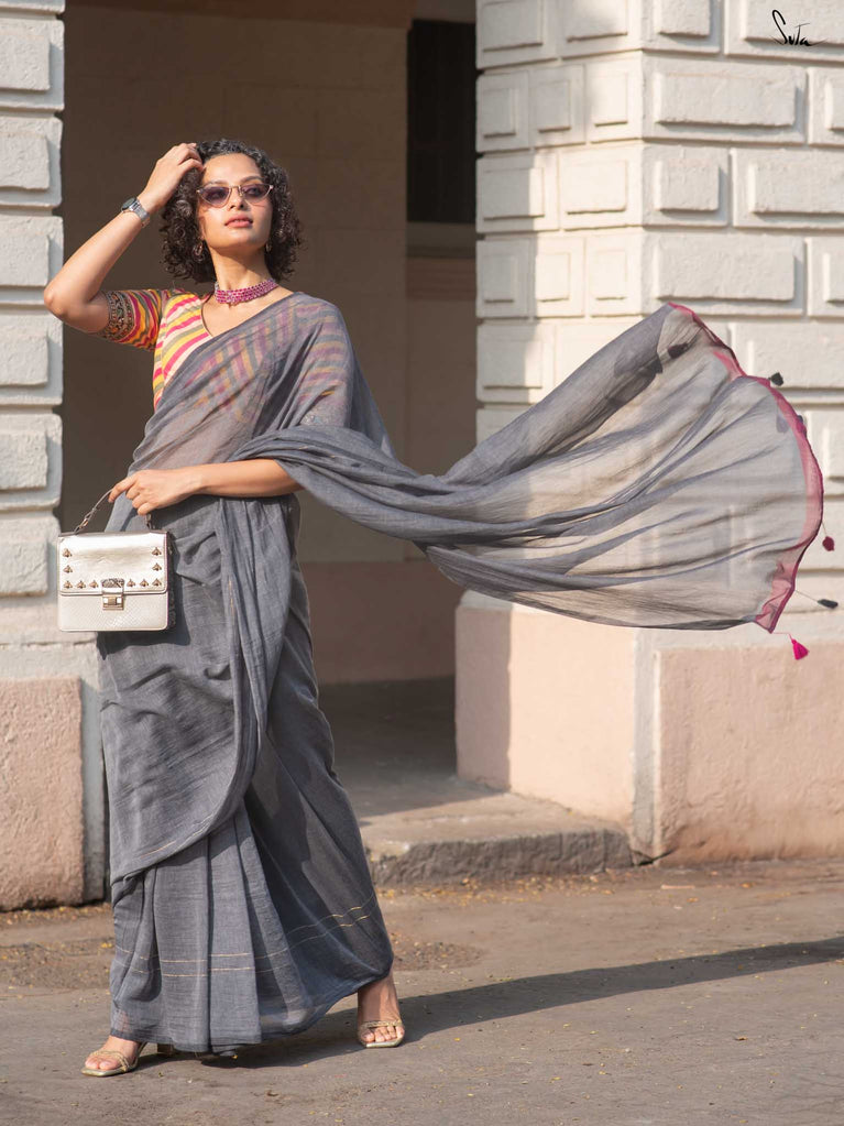 You’re the moon; soft, glowing, impossible to ignore. Inspired by this thought, we designed something that reflects you. This grey mul cotton saree feels peaceful and grounding, like a quiet moment to yourself. The zari-lined border adds just the right amount of shine, while the magenta-accented pallu brings in a soft pop of brightness. The contrast of grey and magenta tassels ties it all together with thoughtful detail. It’s perfect for slow festive mornings, quiet rooftop evenings, or cozy, intimate gatherings.