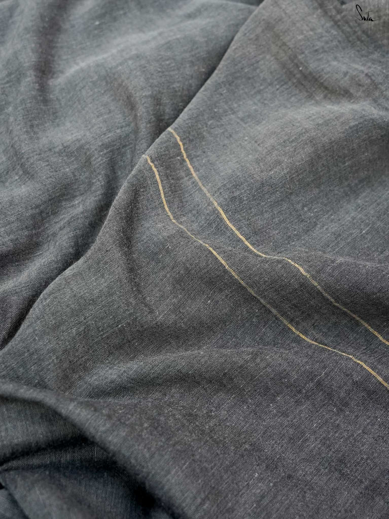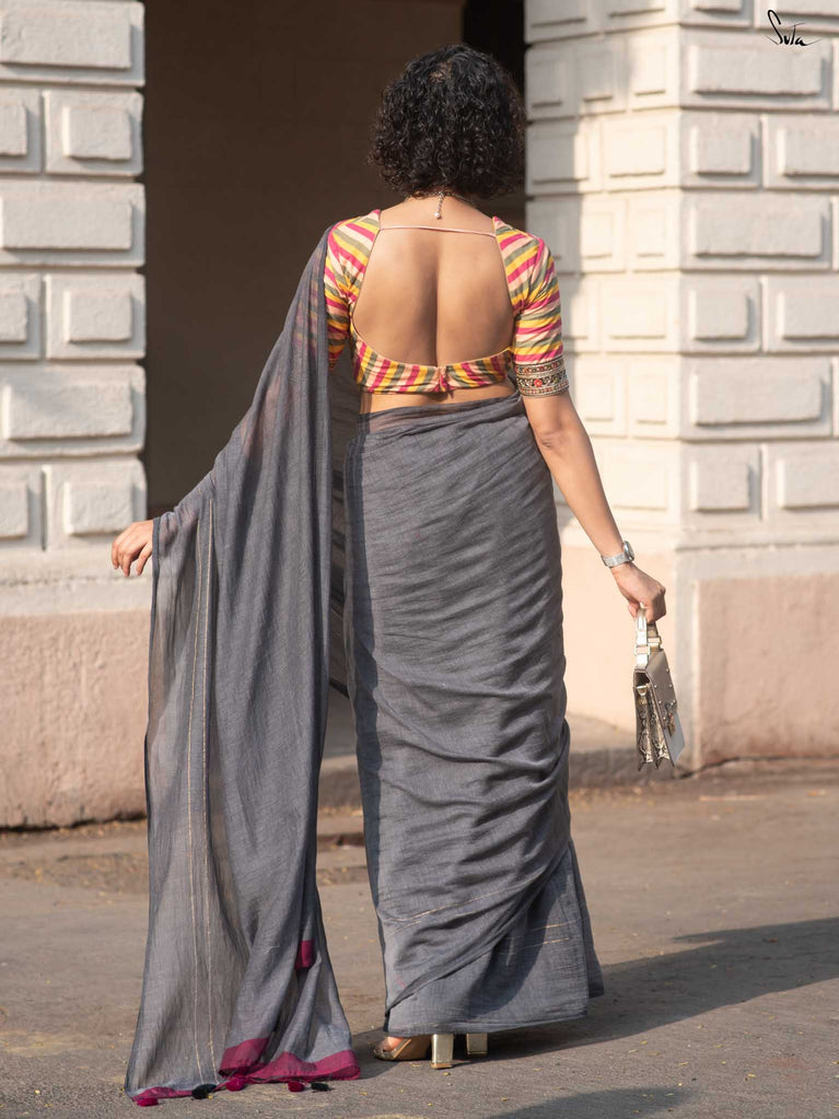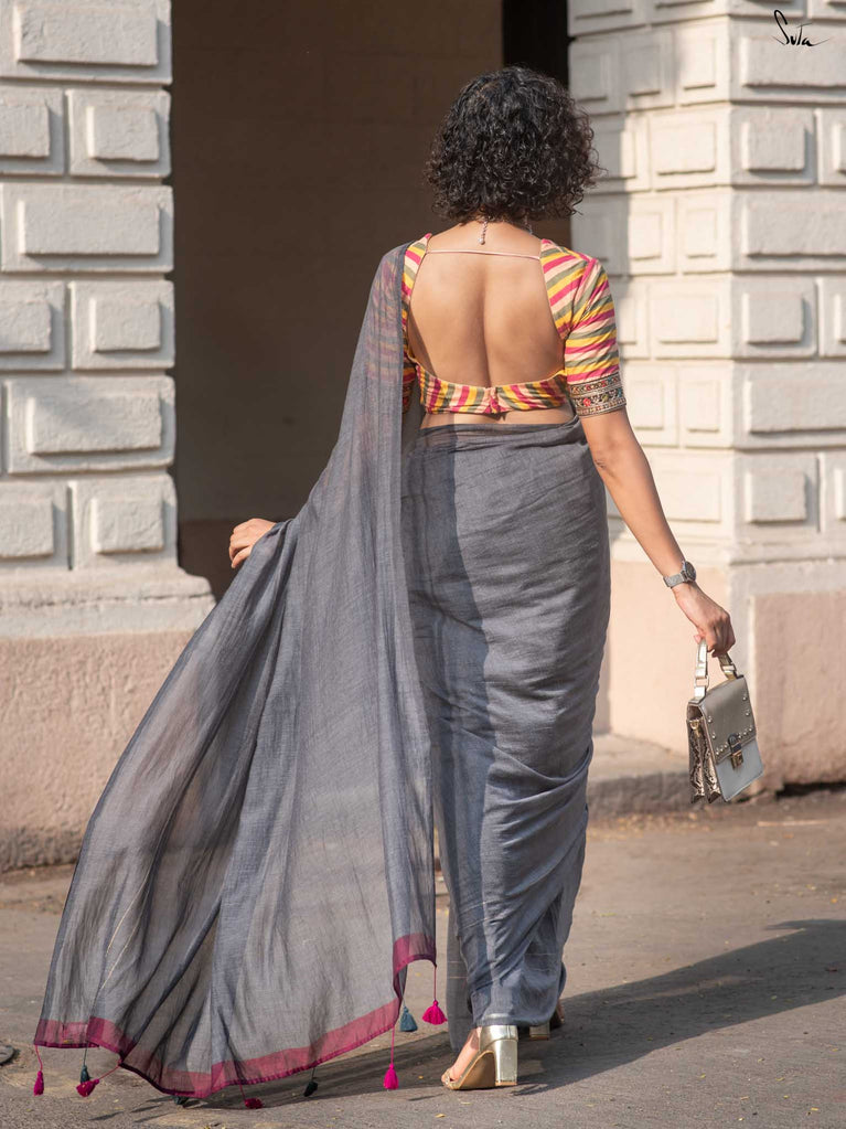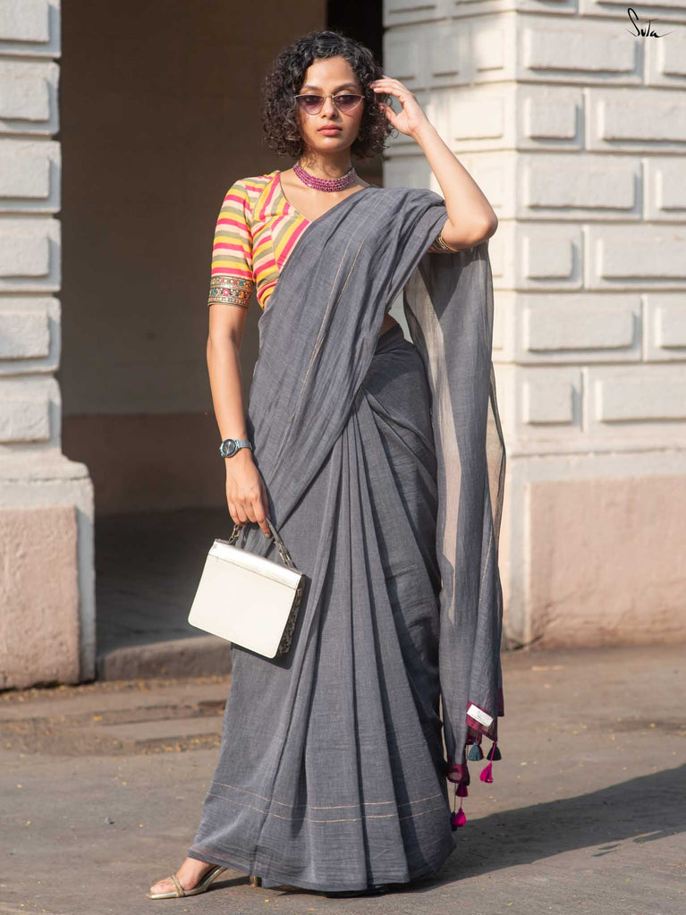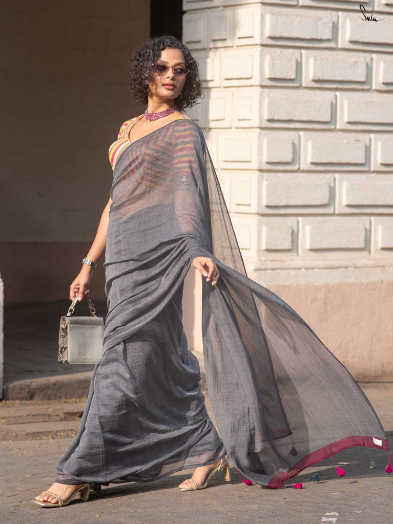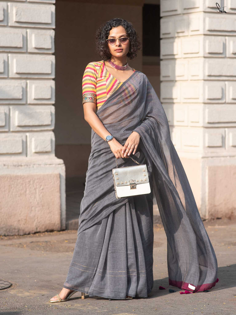 You’re the moon; soft, glowing, impossible to ignore. Inspired by this thought, we designed something that reflects you. This grey mul cotton saree feels peaceful and grounding, like a quiet moment to yourself. The zari-lined border adds just the right amount of shine, while the magenta-accented pallu brings in a soft pop of brightness. The contrast of grey and magenta tassels ties it all together with thoughtful detail. It’s perfect for slow festive mornings, quiet rooftop evenings, or cozy, intimate gatherings.