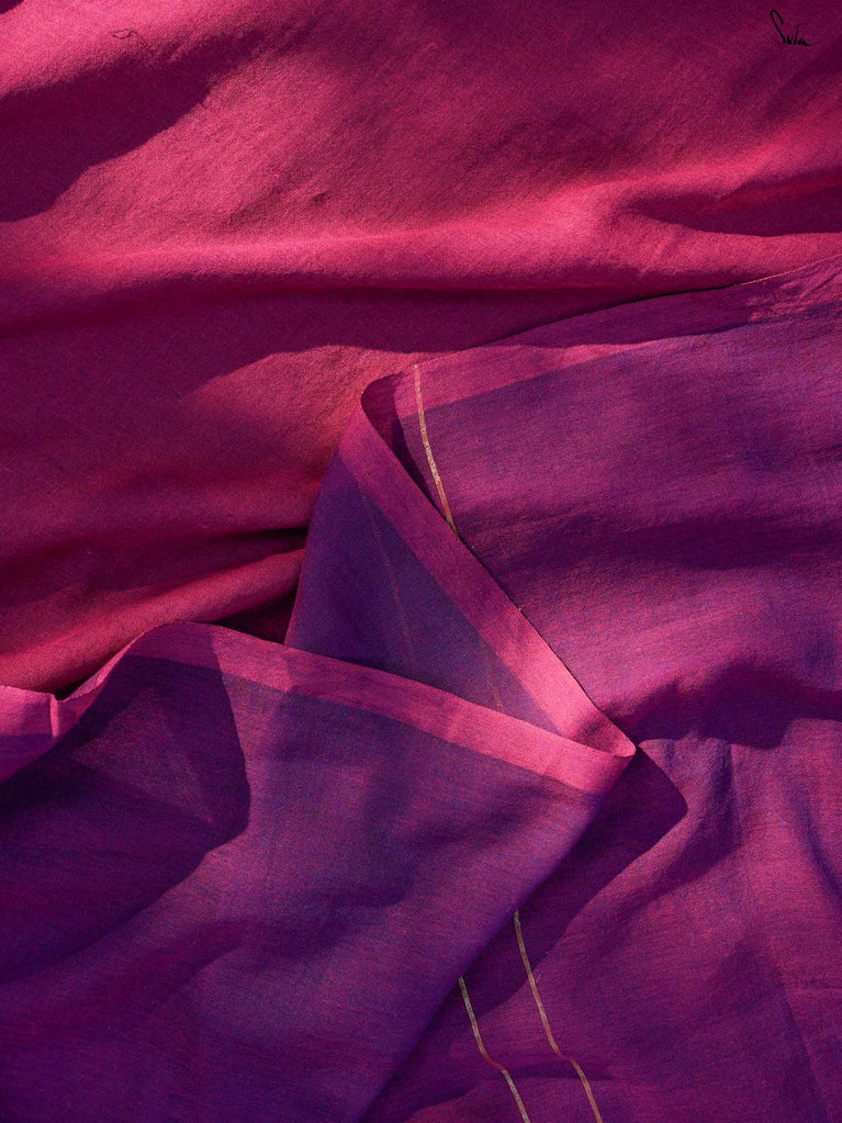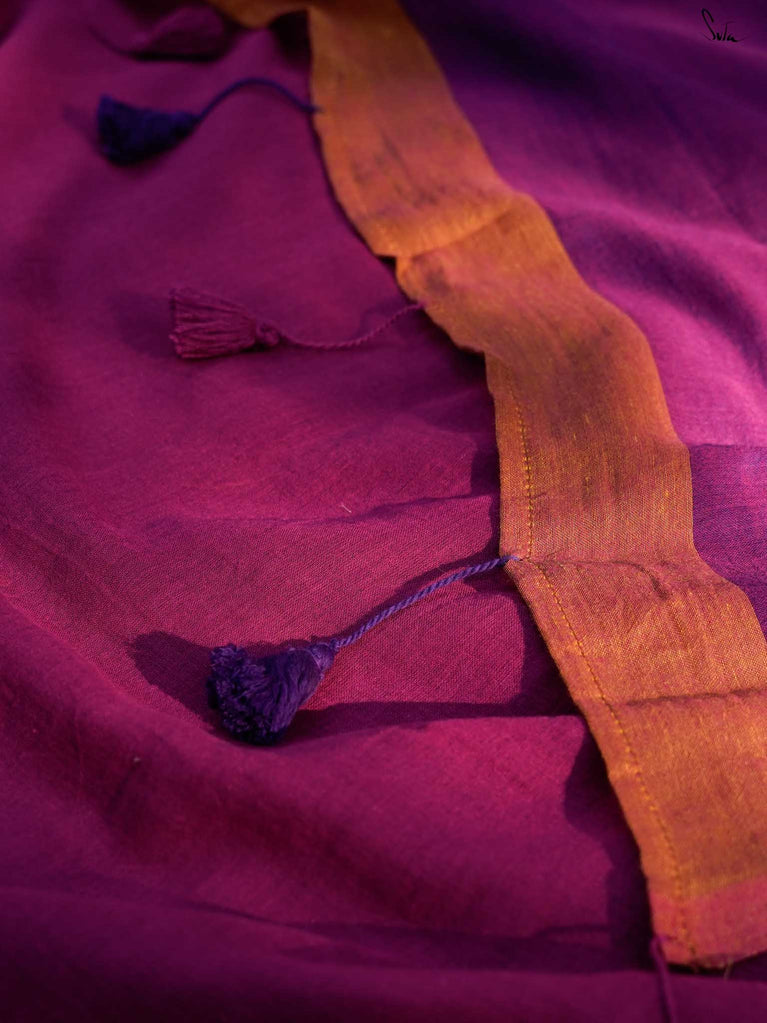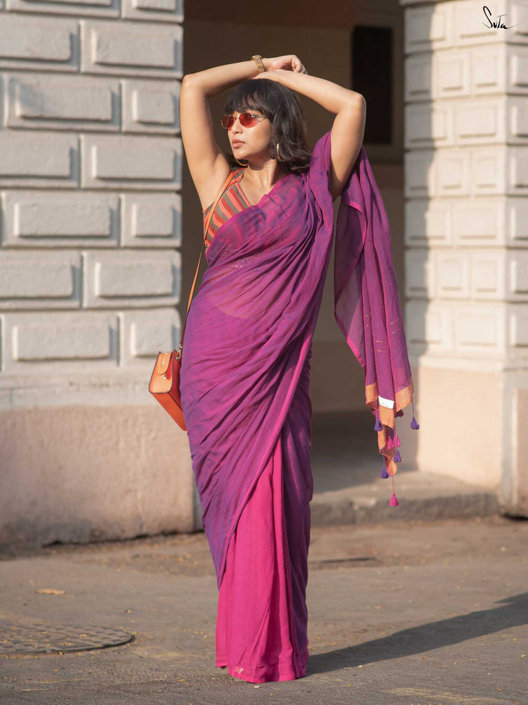 Inspired by the first ray of dawn, Dancing Dhoop makes you dance with joy. This Purple and magenta mul cotton saree brings two bright moods in one soft drape.Woven zari lines grace the pallu, while orange accents add a playful charm to the saree. Pink and purple tassels at the edges bring a touch of cheer. This piece is perfect for breezy brunches and carefree evenings.