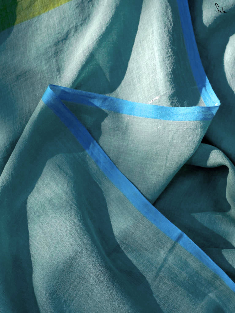 Find your voice in this handwoven blue and green Mashru saree. Made of the finest cotton and silk, this striking saree comes alive with subtle gold and silver zari detailing.