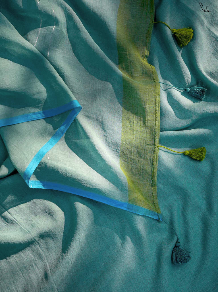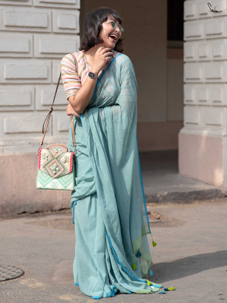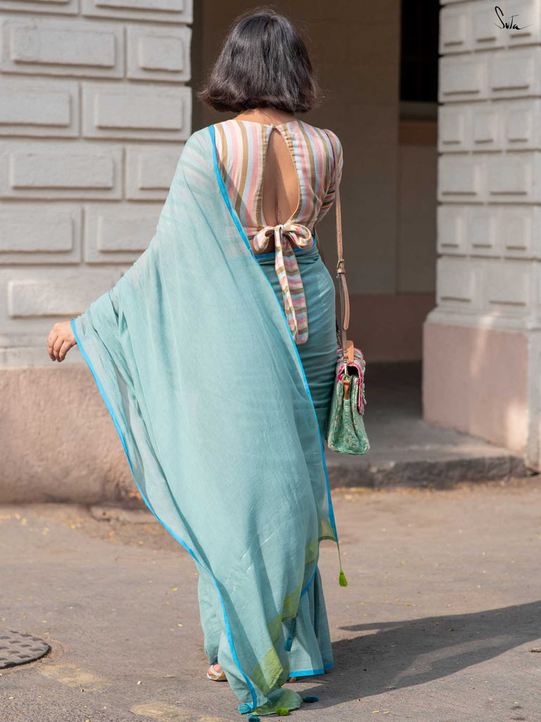 Like silver linings- bright and hopeful, this light blue mul cotton saree is all about easy elegance. The contrast selvedge adds a touch of character, and the zari lines on the pallu catch the light most softly. A pop of lime green and matching tassels bring in a fresh, summery surprise. Perfect for daytime events, office parties, or lunches that turn into laughter-filled afternoons.
