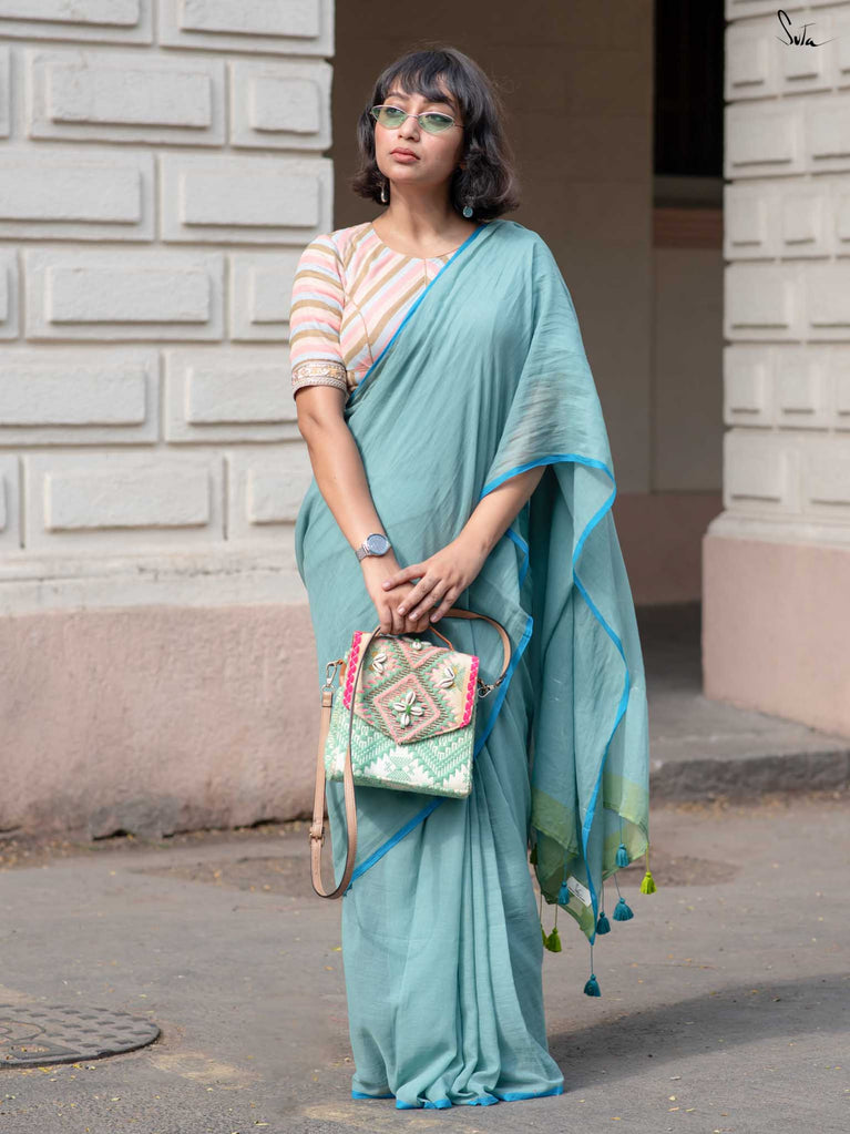 Embrace yourself as you are, for who you are, in this striking blue and green cotton saree with zari detailing.