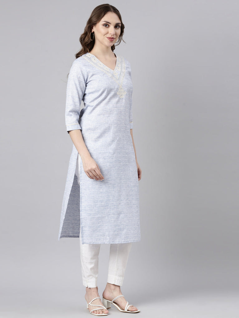 Neerus Blue Panelled Straight Floral Kurtas Effortlessly stylish and comfortable (just like your favorite pair of jeans), these kurtas boast a stunning floral print and a flattering straight fit. Perfect for any occasion, whether you're running errands or attending a wedding.
