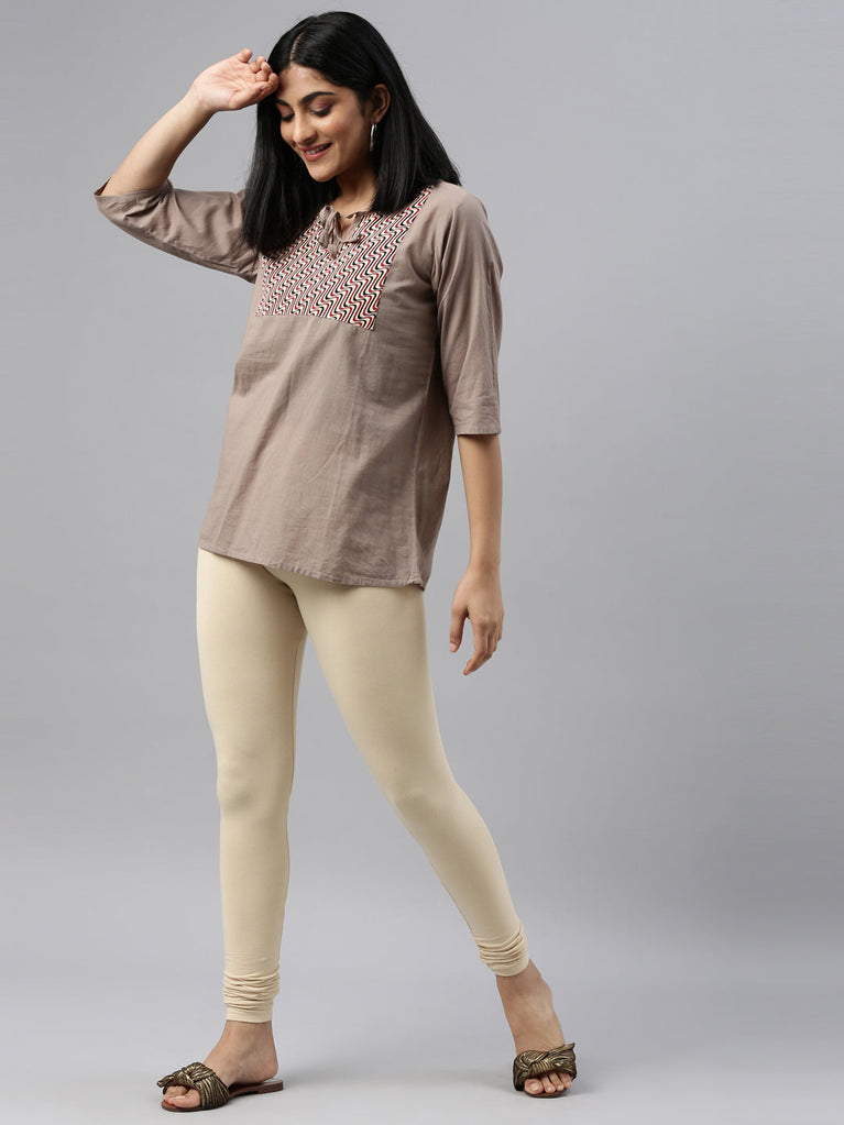 Complete any look, be it traditional or western with these Solid Dark Beige Leggings. Made from cotton & elastane, it has a elasticised waistband & has a slim fit