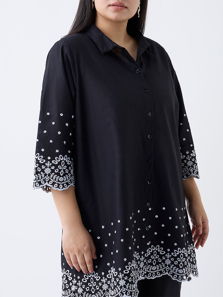 Diza black tunic showcases intricate schiffli embroidery for a distinctly festive appeal. Crafted from a cotton-rich fabric that offers structure with softness, it features a classic collar, button placket, and 3/4th sleeves finished with scalloped edges for a beautifully feminine finish.