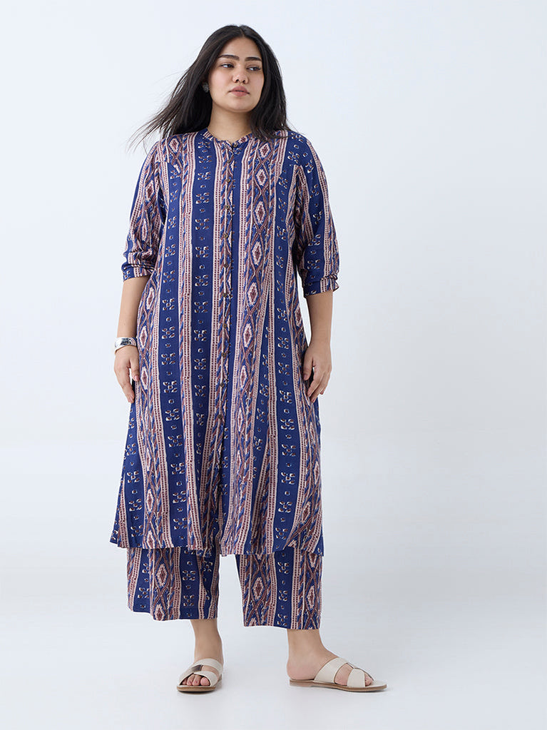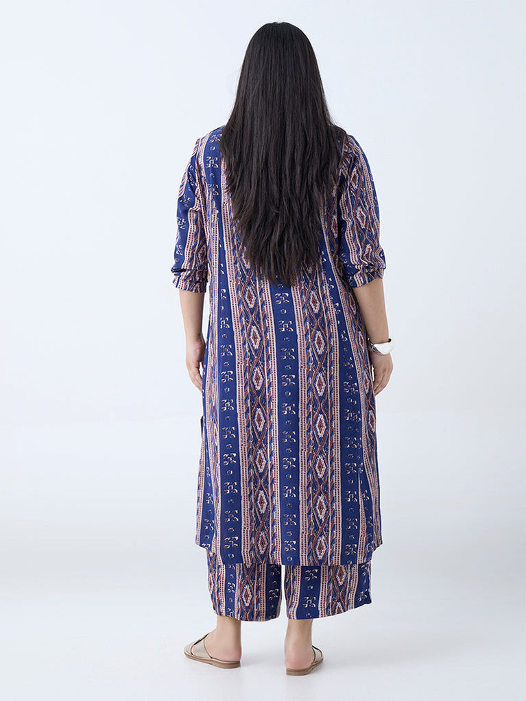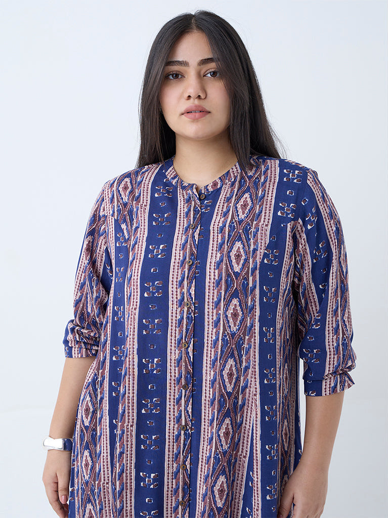 This indigo ethnic kurti from Diza is milled from a super-soft fabric for effortless all-day comfort. Featuring all-over scenic prints, it is detailed with a mandarin neck, a brief button placket, and three-quarter sleeves, blending timeless style with easy wearability.
