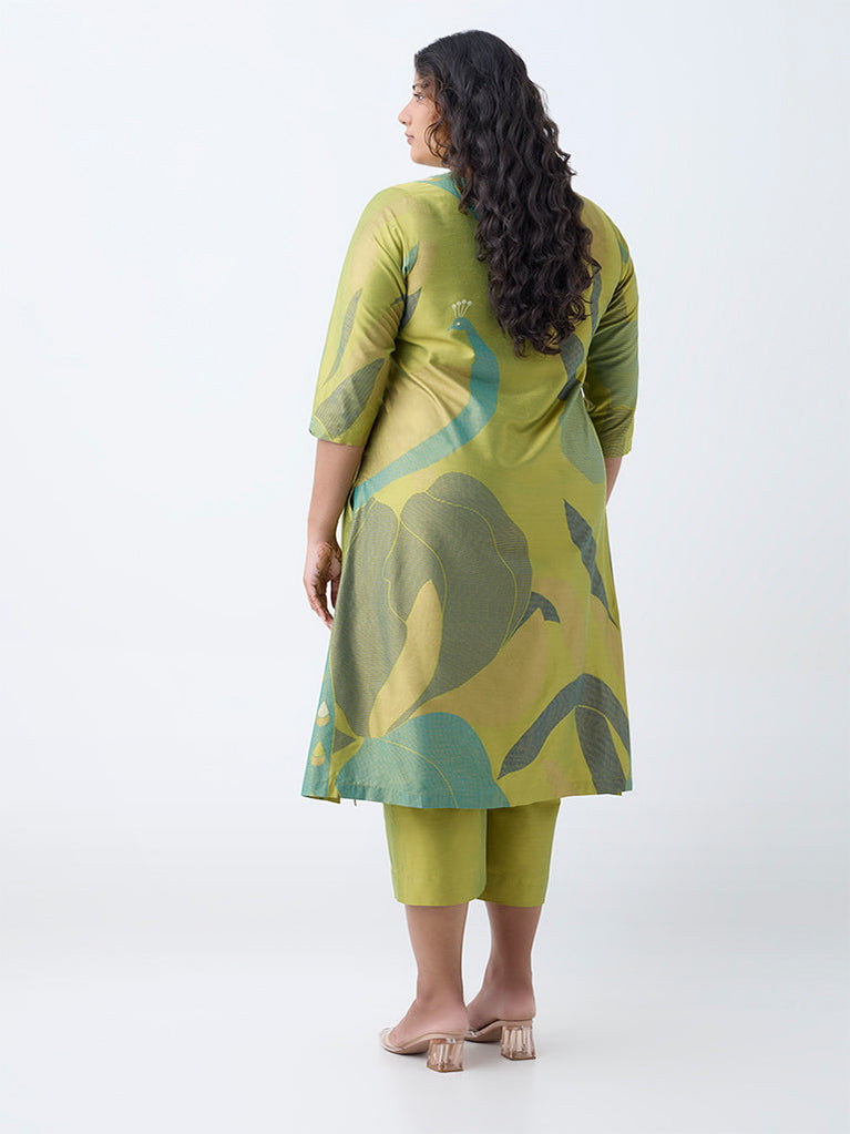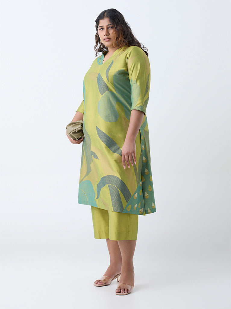 Add a pop of colour to your festive celebrations with this lime A-line kurta from Diza. Featuring playful botanical prints, a V-neckline, three-quarter sleeves, and a practical side pocket, it lifts your wardrobe with cheerful vibrancy—perfect for lively gatherings and seasonal festivities.