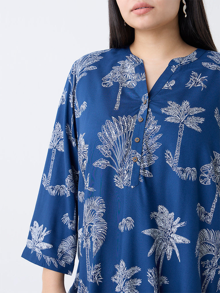 This indigo ethnic tunic from Diza is patterned with leaf prints throughout. Crafted from a breezy fabric, it features a neat collar, a button placket, and three-quarter sleeves for a versatile silhouette.