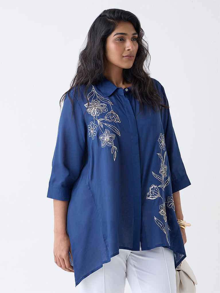 This indigo ethnic tunic from Diza sparkles with intricate sequin floral detailing. The spread collar, concealed placket and asymmetrical hem lend a touch of structure to its fluid charm, while three-quarter sleeves make it ideal for celebratory gatherings and polished daytime dressing alike.
