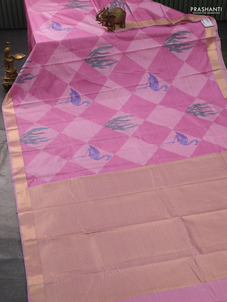 Bangalori semi silk saree pastel pink and magenta pink with allover ikat weaves and zari woven border