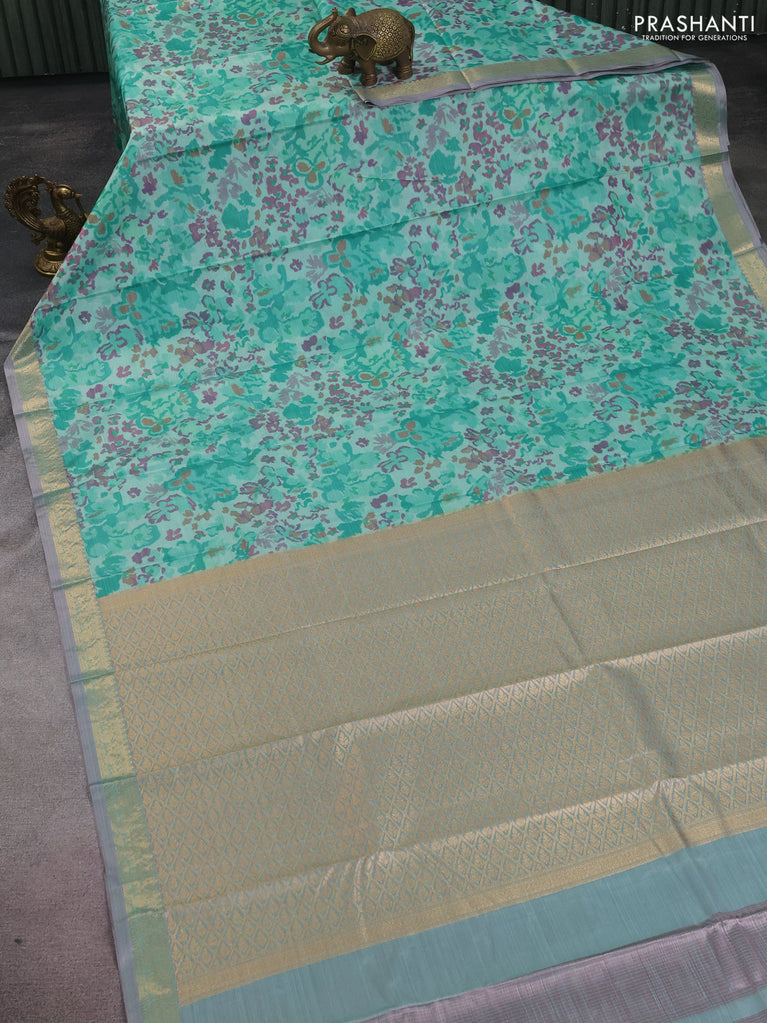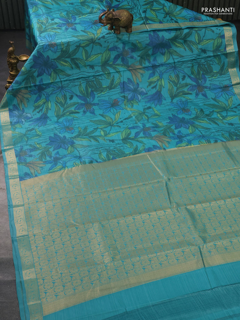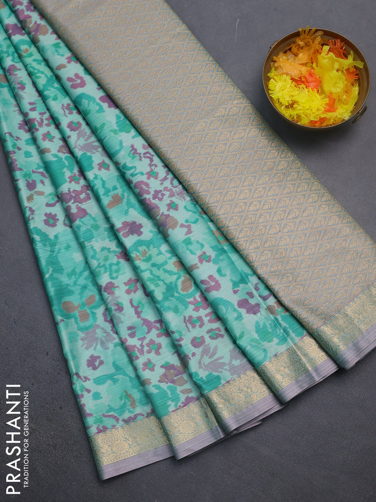 Bangalori semi silk saree teal shade with floral design ikat weaves and zari woven border