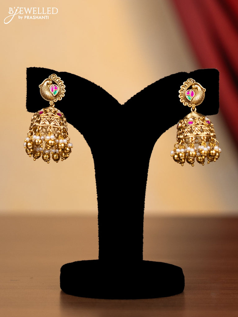 Jadau haaram peacock feather krishna pendant with jadau kundan stones and pearl hanings