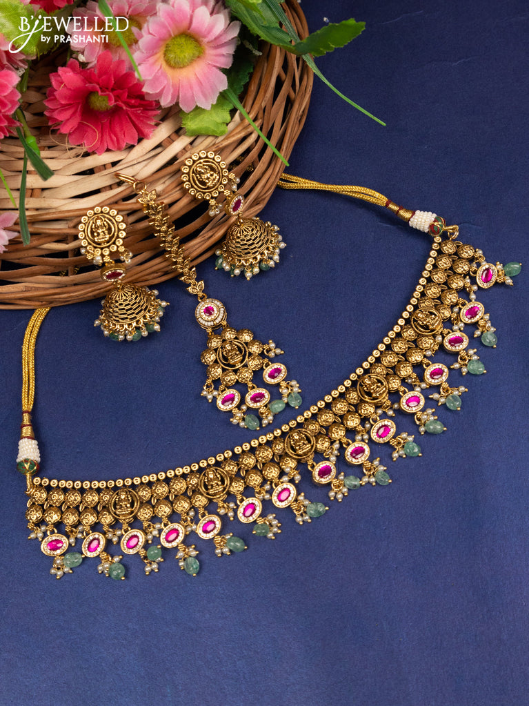 Jadau choker lakshmi design with pink jadau kundan stones and pear & golden beads hanging with maang tikka
