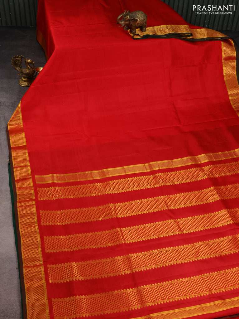 10 yards silk saree teal green and red with plain body and temple design zari woven border
