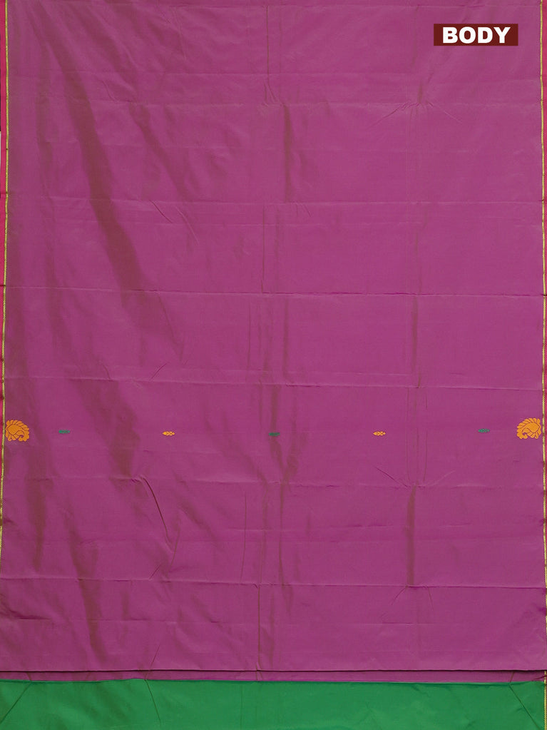 Arani semi silk saree dual shade of violet and dual shade of green with copper zari woven buttas and copper zari woven butta border