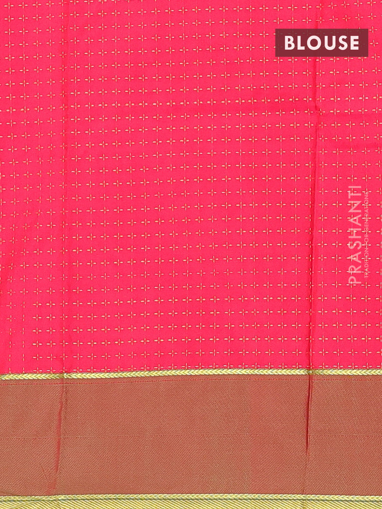 Arani semi silk saree dual shade of sap green and pink with allover copper zari weaves and zari checked border