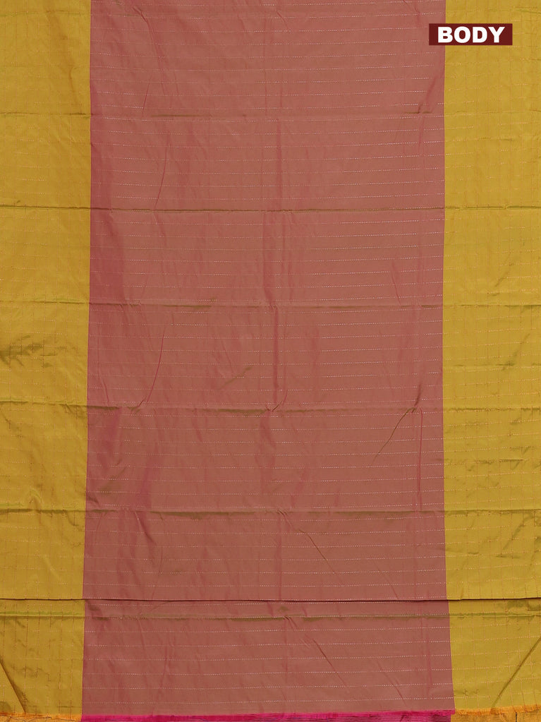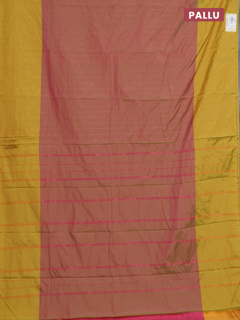 Arani semi silk saree dual shade of pinkish green and lime yellow with allover copper zari weaves and zari checked border