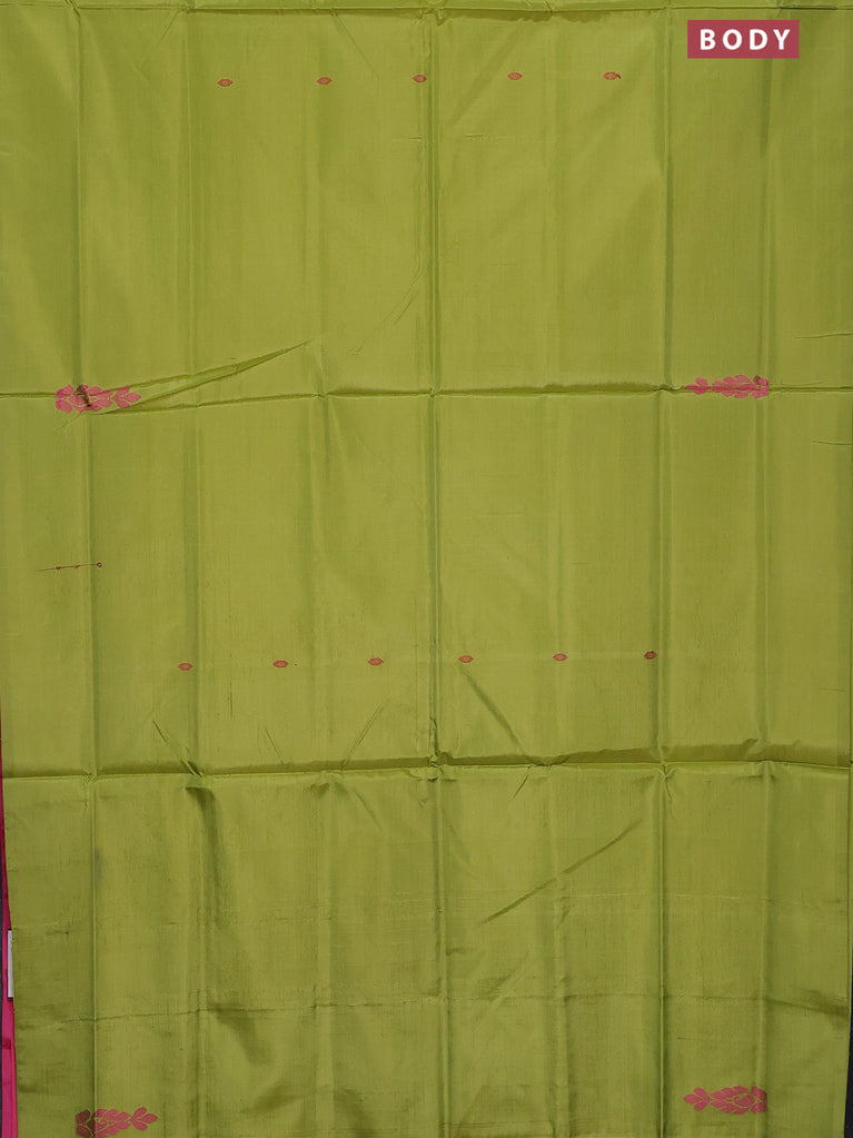Banana pith saree green and maroon with thread woven buttas in borderless style
