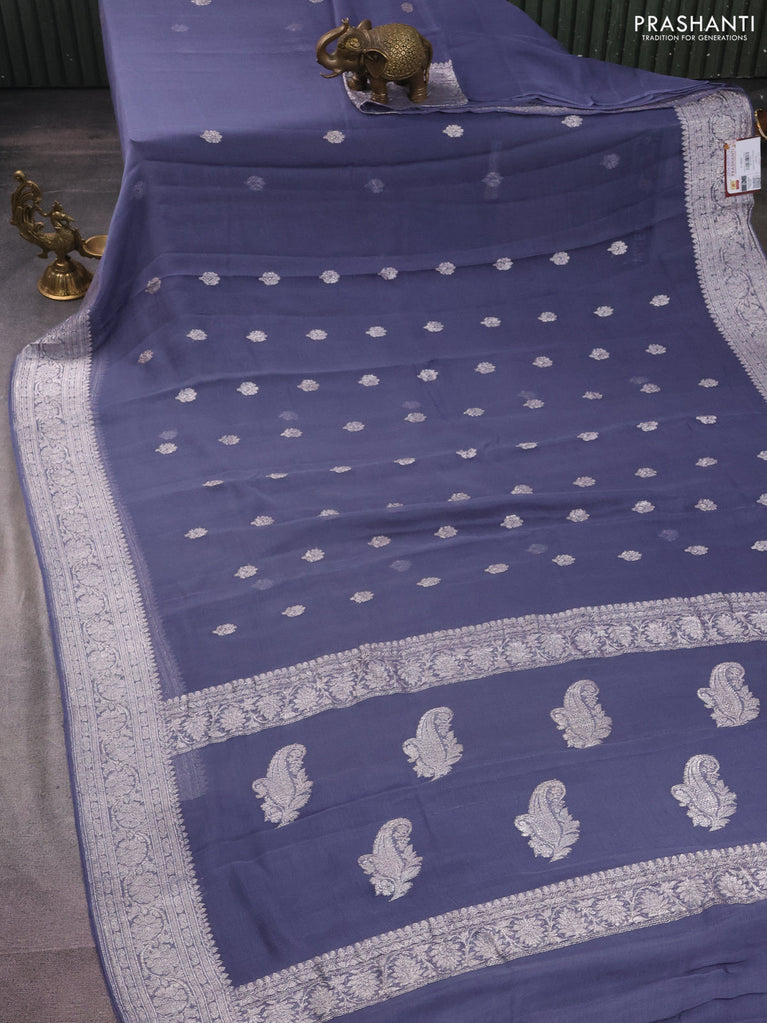 Banarasi chiffon silk saree cs blue with silver zari woven buttas and silver zari woven border