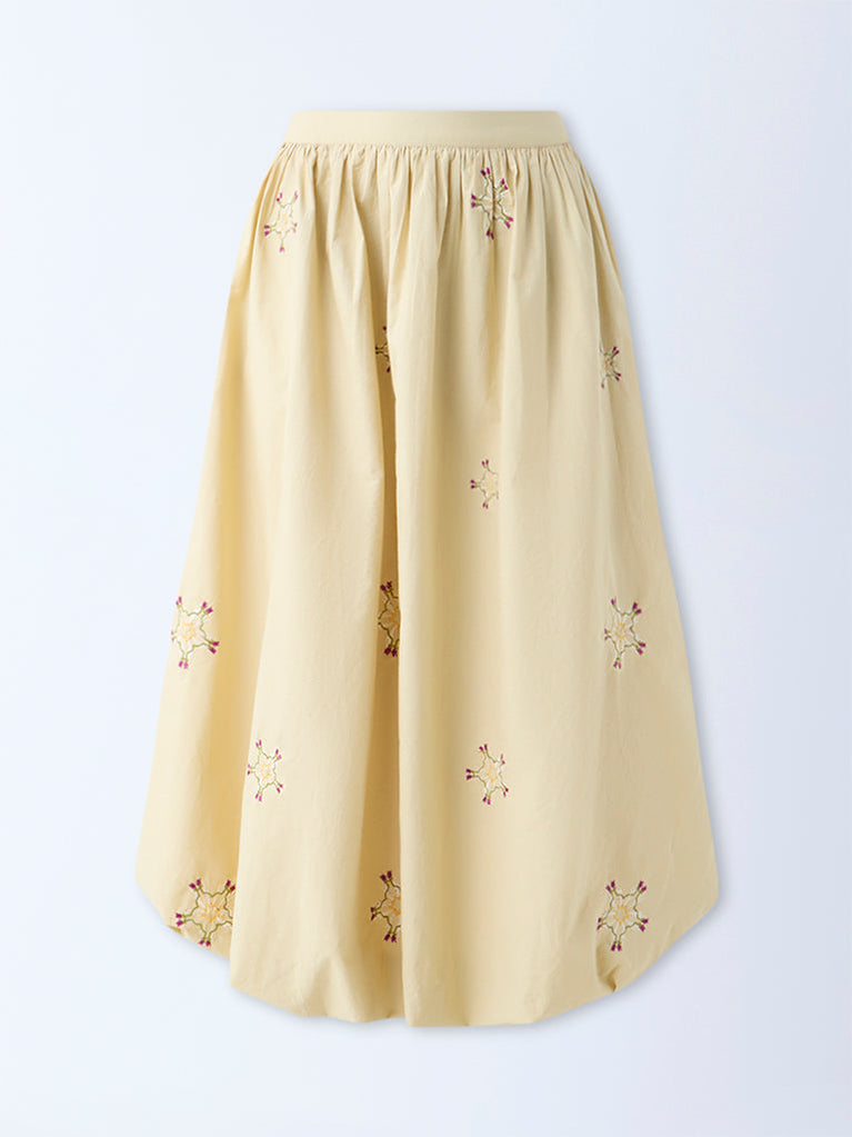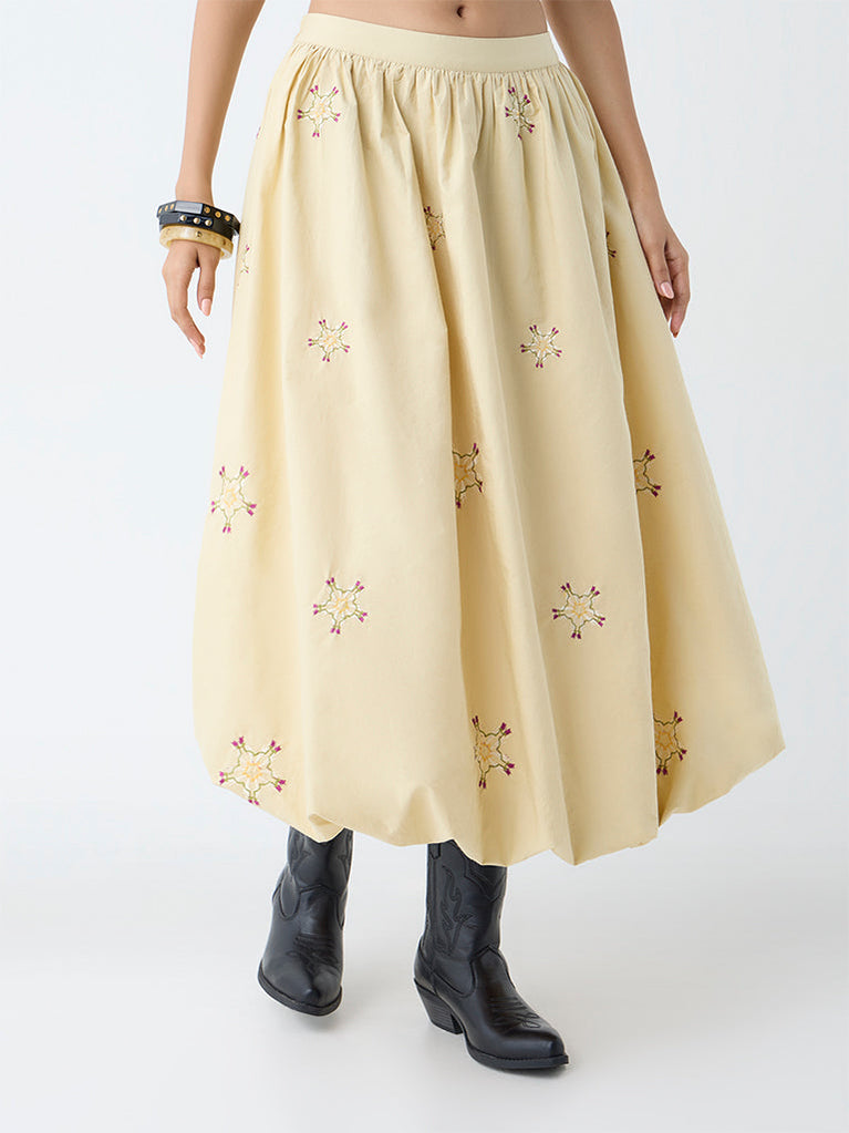 Invest in chic styles like this beige skirt from Bombay Paisley. Adorned with delicate floral embroidery on a voluminous bubble silhouette, it adds playful movement and effortless charm. Crafted from a cotton-rich fabric, it features an elasticated waistband and functional side pockets for added practicality.