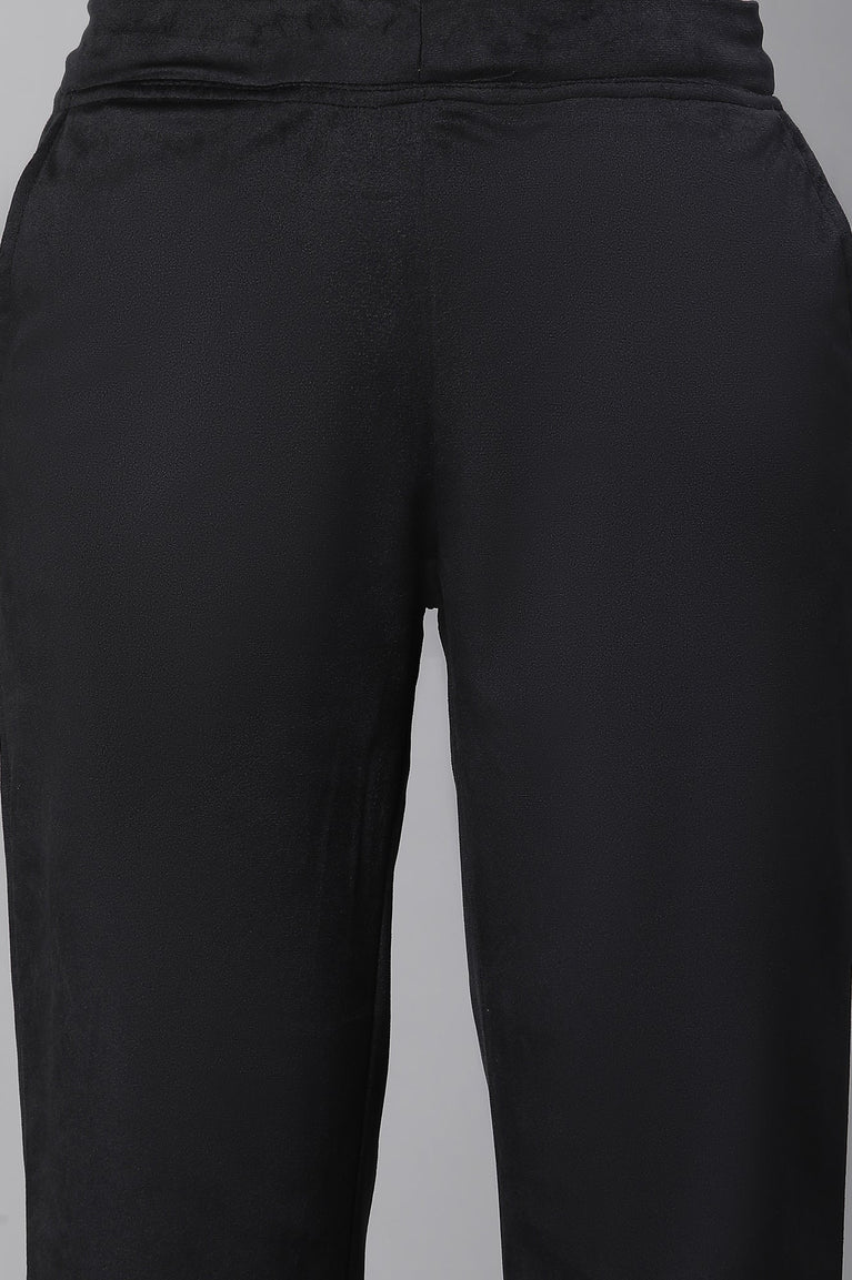 Crafted from luxurious velvet knit fabric, these black straight-fit pants redefine winter elegance. The parallel silhouette offers a sleek and polished look, while the elasticized waist ensures comfort and a perfect fit. Functional side pockets add practicality, making them ideal for festive occasions or cozy evenings. Pair them with a chic kurta or a stylish top for a versatile ensemble that exudes sophistication.