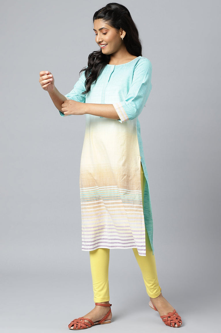 An exclusively curated kurta in textured cotton with a serene ombre of blue & yellow and a play of shaded stripes at the bottom. It can be paired with yellow palazzo. Add this to your collection and treat yourself.