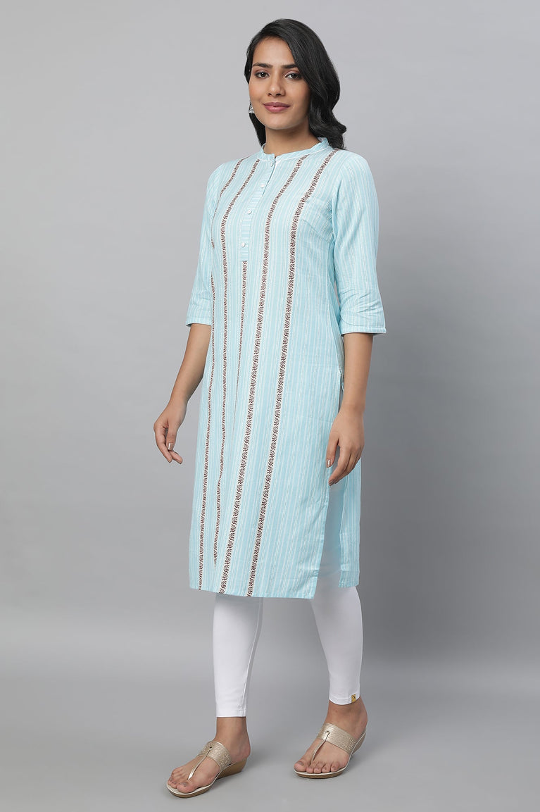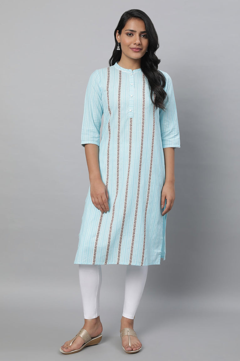 Blue cotton printed kurta in straight silhouette and band collar. The kurta is paired with white tights.
