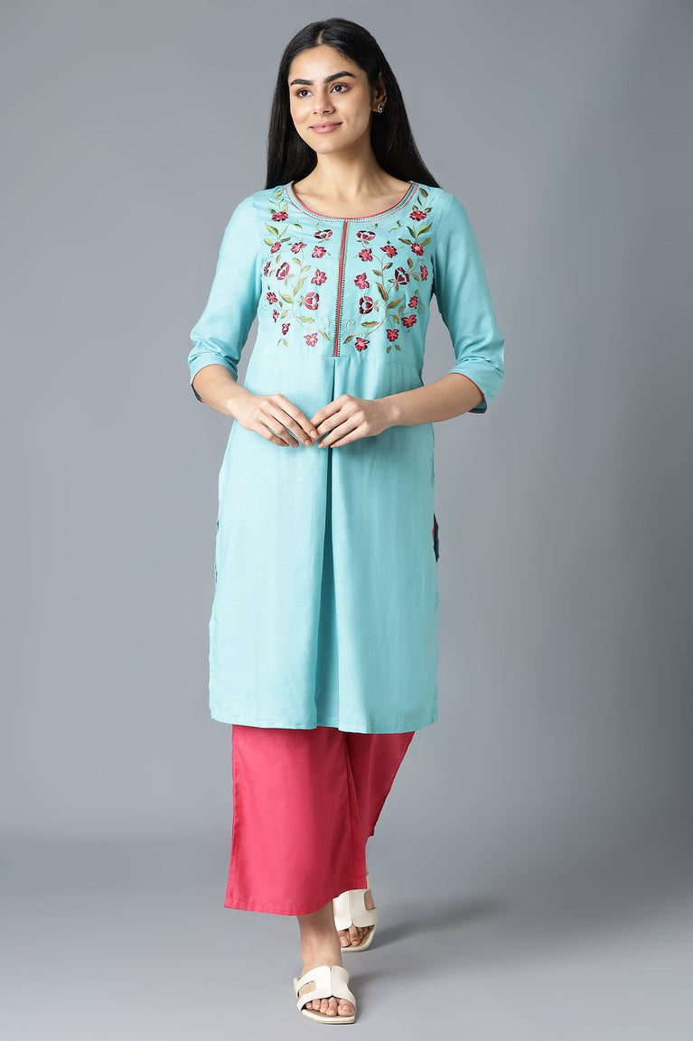 Blue Embroidered kurta In Round Neck With Pink Straight Palazzo