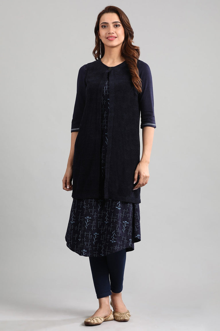 Blue round neck full sleeve knitted kurta with embroidery detail.