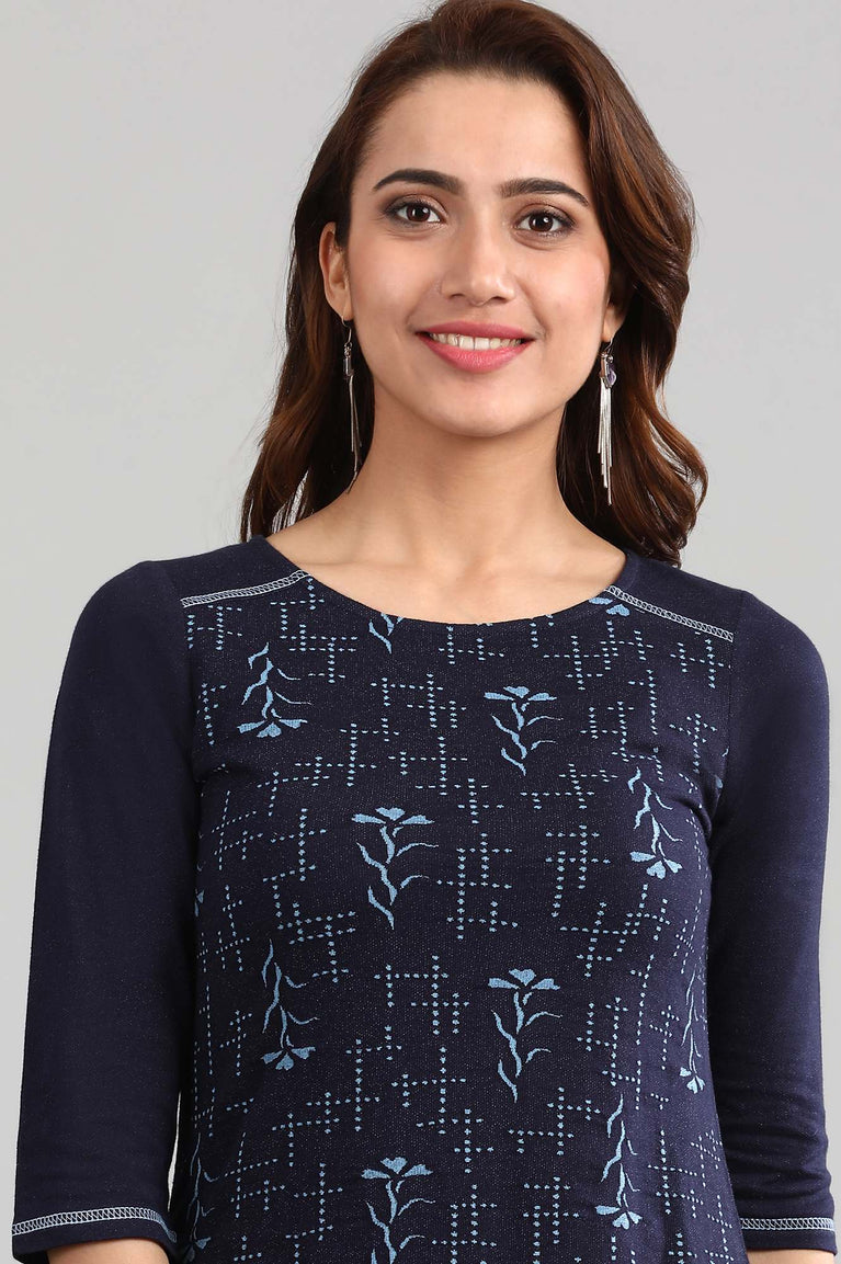 Blue round neck 3/4 sleeve kurta with printed detail and tie-up at both sides.