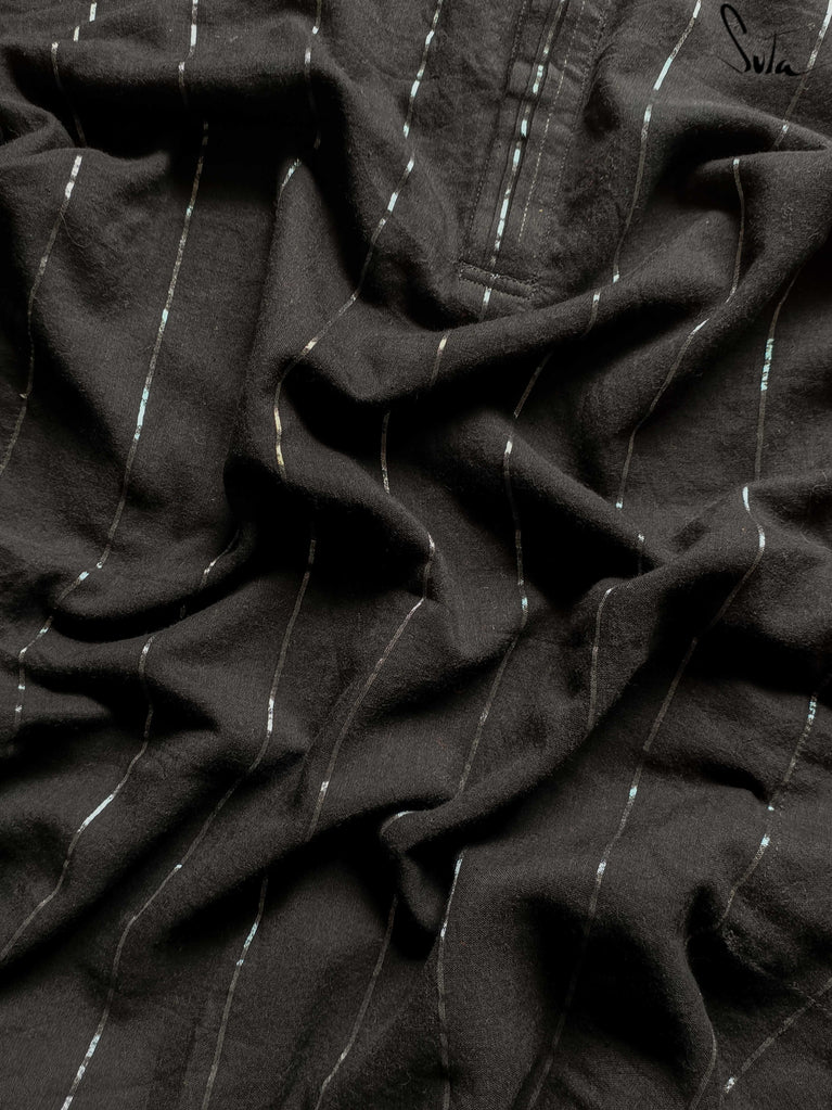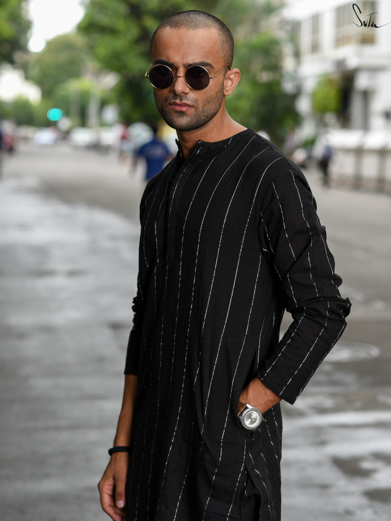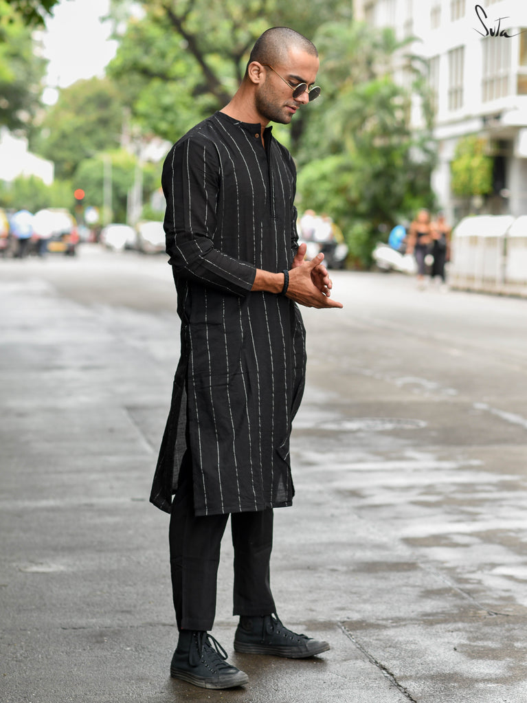 Description: This black Jacquard kurta is the perfect choice for any man who desires both comfort and style. Suitable for both formal and informal events, it is crafted from a jacquard base and features a bold stripe design, making it a statement piece.