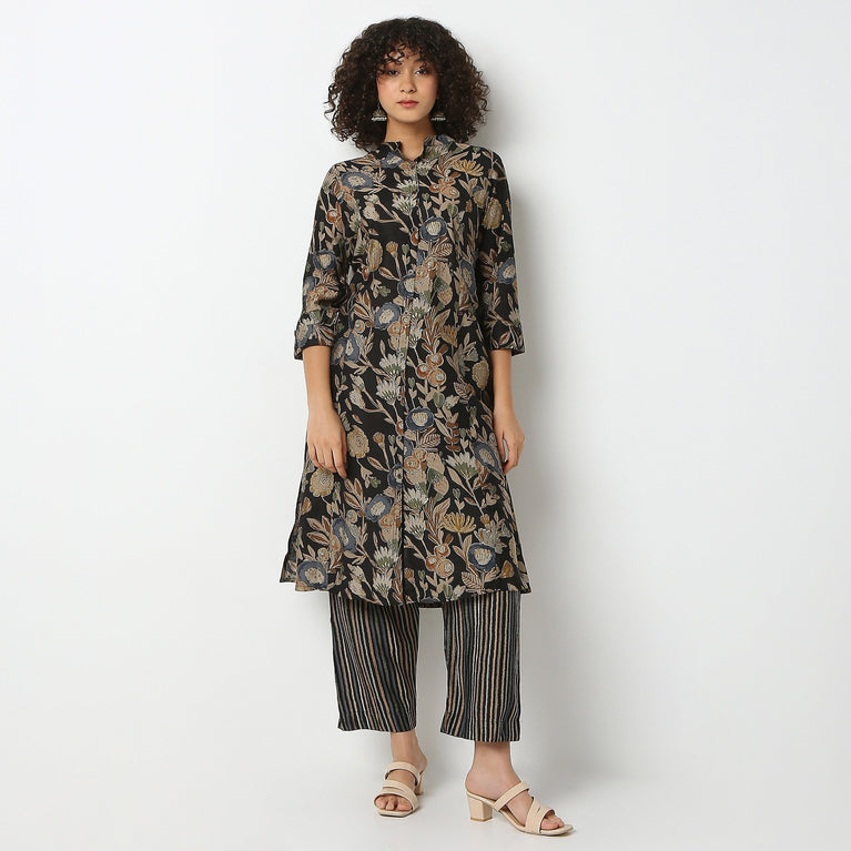 Band Collar Knee Length Three-Fourth Sleeve Flare Fit Printed Kurta With Pant Set