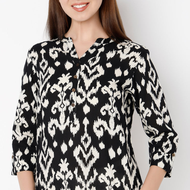 Band Neck Three-Fourth Sleeve Straight Fit Printed Short Kurta