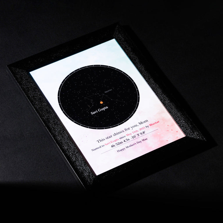 Moms are the guiding light of our lives. They deserve the universe. Let's give them one then.Name a star after your mom and frame it with love, complete with her name and constellation details. Simply share her name, select the zodiac and the date, and a star will be named exclusively for them.The star comes customized with your mother's name and a constellation chart showcasing the exact location of the star. You can also add a personalized message to make it even more touching. How does 'Name a Star' actually work? This unique service utilizes the 'Star Dedication Archive,' a comprehensive database of recognized stars in our solar system with their precise coordinates. Once a star is dedicated, it receives a special name and a certificate is generated for it. The registration number on the certificate provides exclusive access to the star's details in the archive, ensuring that no other star will bear the same name. Specifications -Size of the frame with glass - A3 (29.72 x 41.91 cm)Please note that Oye Happy is a facilitator for the naming service, GiftYourStar, which is an Accredited Registrar of the Star Dedication Archives. The star can only be booked for the current year, not for previous years. If you input the date of the occasion as 17/03/1987, the star will automatically be booked for the current year, regardless of the entered date. If the sender's name is not provided, we will list it as "Star is named by Special Person" on the certificates