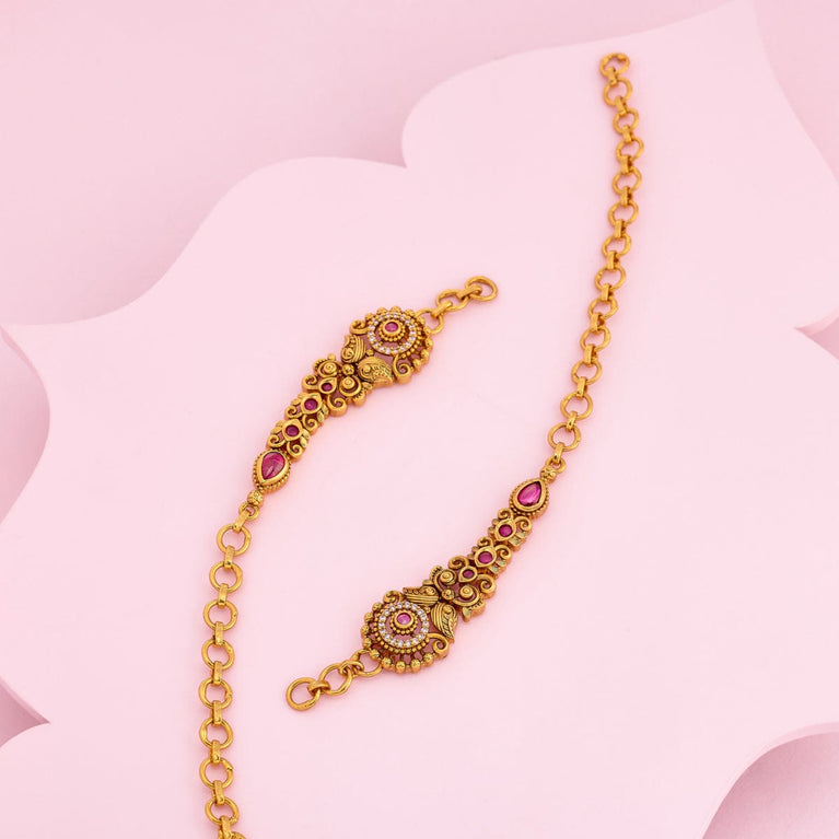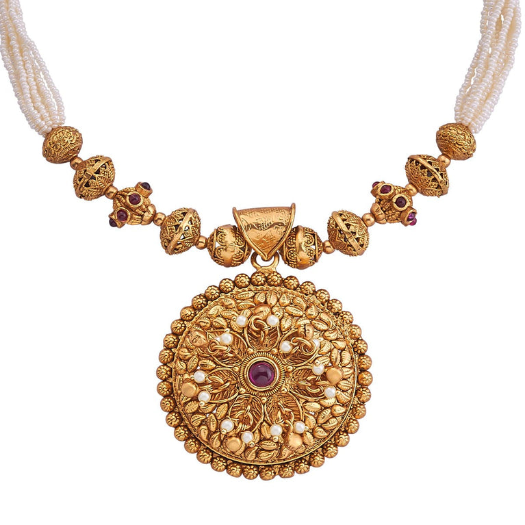 Kushal's Fashion Jewellery Antique NecklaceJewellery is the favorite element among women, boosting your looks and self-assurance. Antique jewellery has become a trend lately. Make your impression long-lasting with this ancient and classic piece of antique necklace. This piece is intricately designed, gold-polished and studded with ruby stones, demonstrating a masterpiece of the vintage era.