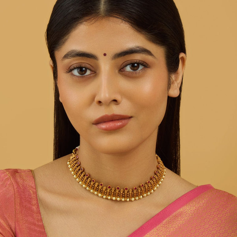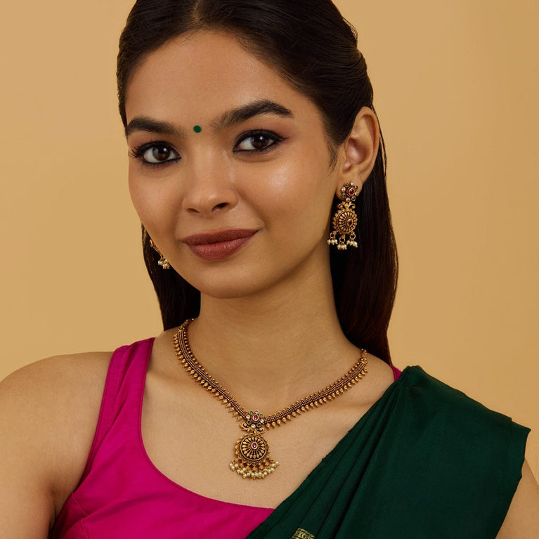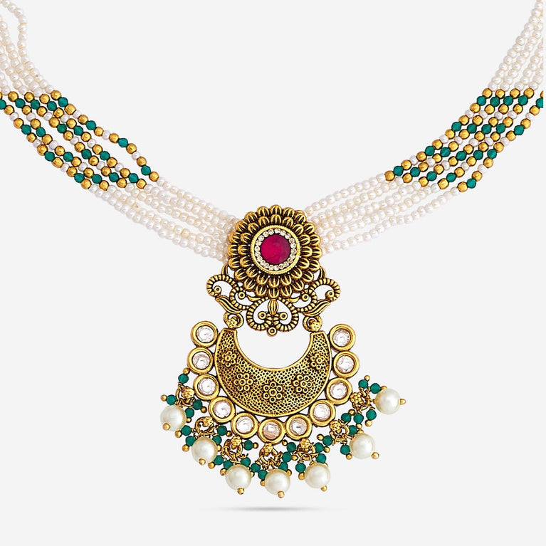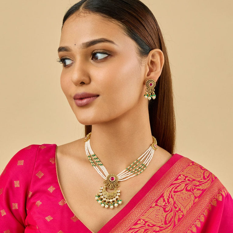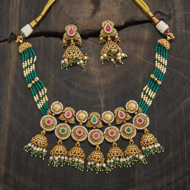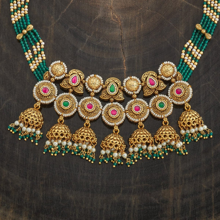 Kushal's Ruby & Green Necklace Set With Stones & Beads With a ravishing pattern on the short necklace and a pair of matching jhumka earrings, this jewellery set with an antique touch will make you the show-stopper wherever you go. Embellished with ruby and green stones set in a linear pattern and hanging beads, it is plated in gold. This necklace set has a distinctive charm and is perfect for wedding seasons.