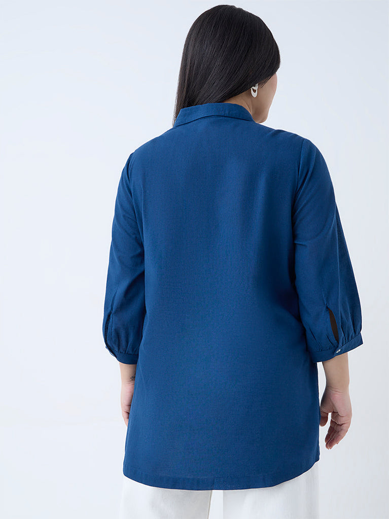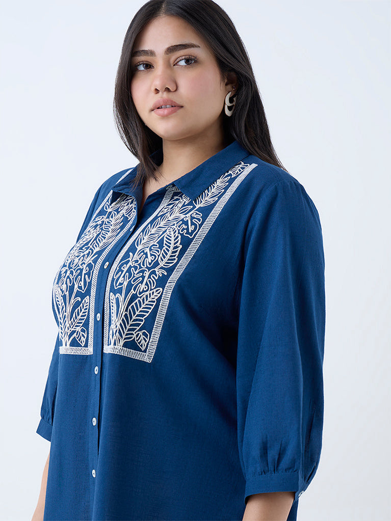 Milled from pure cotton, this indigo tunic from Diza pairs breathable comfort with quiet craftsmanship. The yoke flaunts intricate botanical embroidery that adds depth to its clean silhouette. Designed with a sharp collar and three-quarter sleeves, it offers a relaxed yet put-together look.