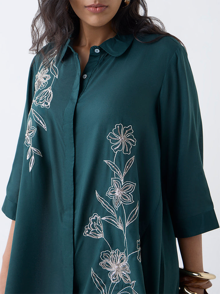 A celebration of colour and craft, this green tunic from Diza is enriched with sequin floral embellishments that catch the light beautifully. The asymmetrical hemline, spread collar and concealed button placket lend a chic edge, perfect for festive occasions or elevated daywear.