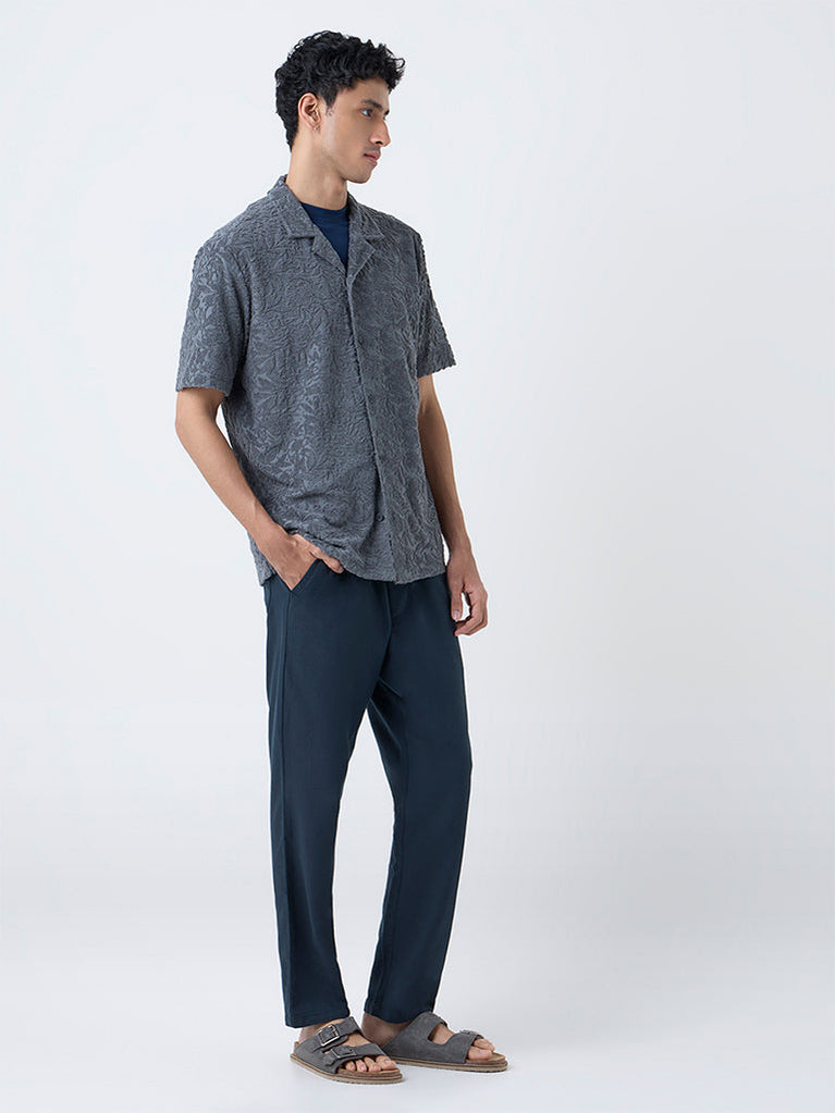 ETA’s indigo shirt stands out with understated embroidery that adds quiet detail to its crinkle-textured cotton base. The relaxed fit offers ease without compromising structure, while the camp collar, half sleeves, and button placket keep the look clean and current.