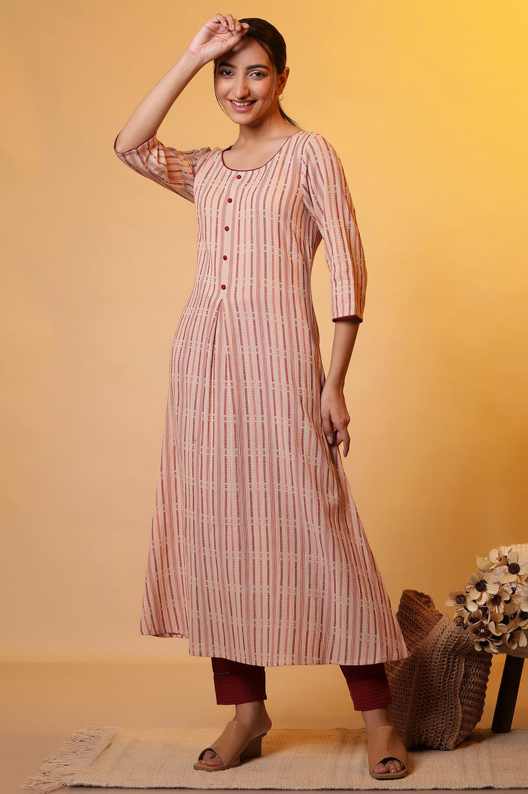 Beige coloured flared kurta having round neck type with slip-on closure and three-quarter sleeves.