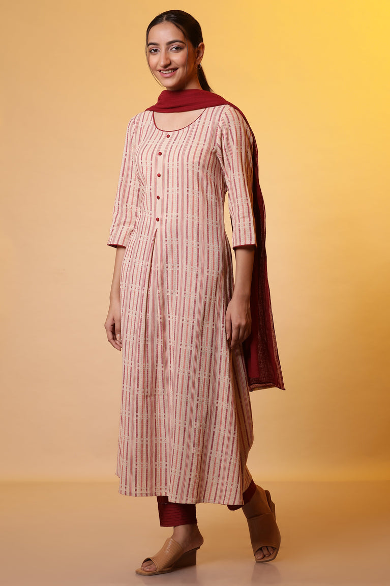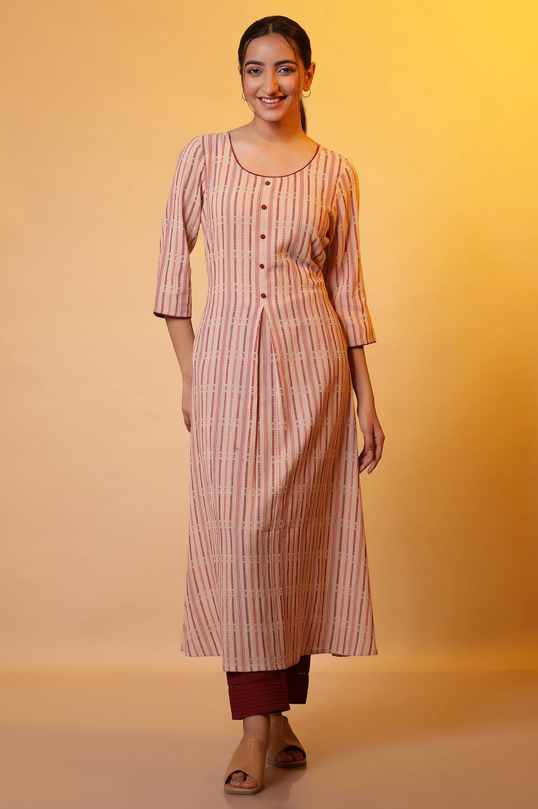 Looking for something flowy yet sophisticated? Then here is the style for you. It is a flared style kurta with inverted box pleat given as a placket with a pop of colored buttons to enhance its beauty. The fabric used is dobby with nice vibrant coloured stripe texture which gives a very nice handfeel to the pieace that falls on your body flawlessly.