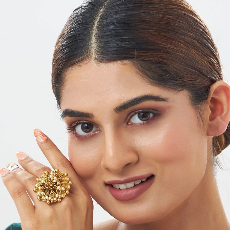 Intricate, festive, and contemporary, this fine ring is all. Adding a refreshing feel of full bloom, the white pearls, embossed gold plated floral design, floral rim, and hint of ruby stone, makes your look more exquisite and unique.