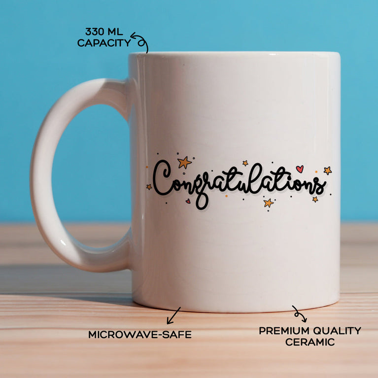 New job? Big win? Dream come true? This mug is made to say “Yay, you did it!” It is perfect for celebrating life’s little victories.Specifications:Capacity of the Mug - 330mlMaterial - CeramicThe mug is microwave safe.Content on the Mug - Congratulations