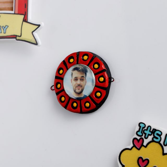 Give your brother a Raksha Bandhan surprise with a customized rakhi featuring his photograph!Just upload his photo, and we’ll craft a unique rakhi that will leave him amazed.The gift box also includes a magnet. After your Rakhi celebrations, simply glue the magnet to the rakhi, turning it into a fridge magnet. Specifications:If you order for multiple rakhis, kindly upload multiple photos by clicking on the Customize Now buttonApproximate size of the Rakhi: 2.5 x 2.5 cmThe rakhi is made of terracotta clay which is soluble in water and is eco-friendlyThe gift box includes a bottle of roli and chawal