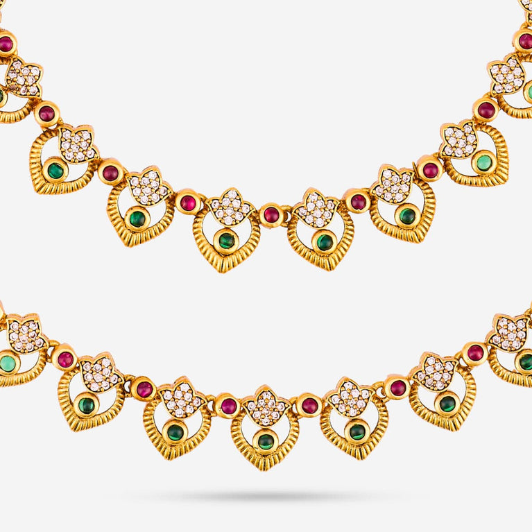 Kushal's Fashion Jewellery Antique TikkaA magnificent Tikka can make your outfit go from bland to eye-catching, which is why we present our latest antique Tikka. The best part of this Tikka is the gold polish that compliments the shine of the ruby, green, and ruby-green stones used in it. Wear it with your favourite outfit.