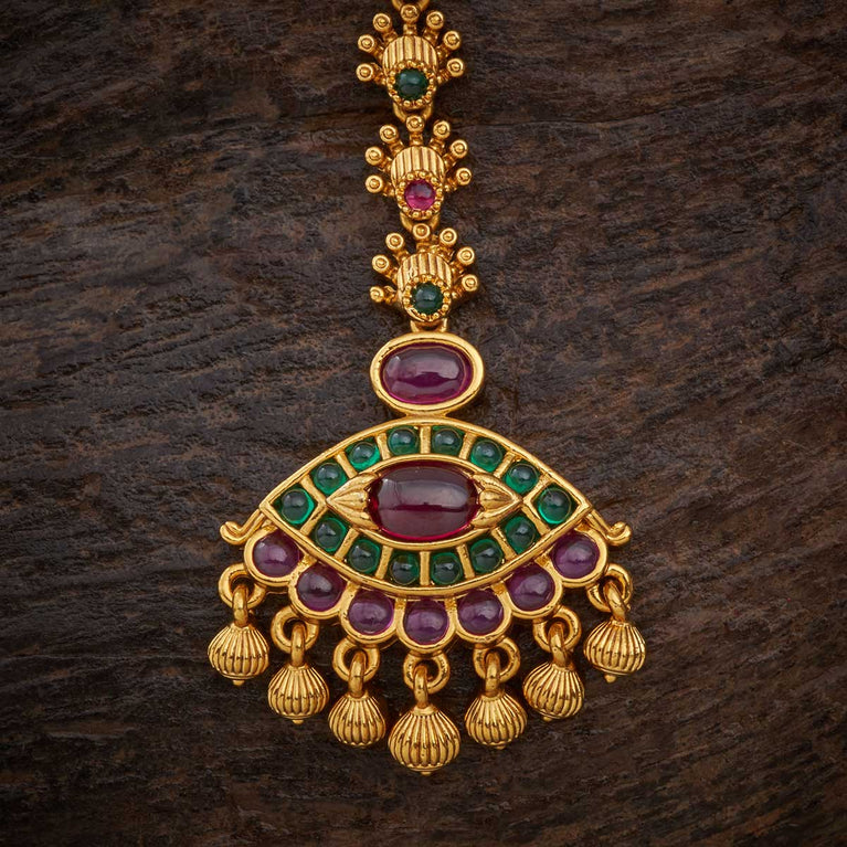 Kushal's Fashion Jewellery Flower Motif Antique TikkaMaang tikka, made for the perfect bling, was developed for today's society. A maang tikka is perfect for every occasion and comes in various colors to suit your unique preferences. This maang tikka is constructed of ruby-green, green and ruby beads, and artificial stones, giving you a festive look. It has a floral motif with rubies incorporated in it.