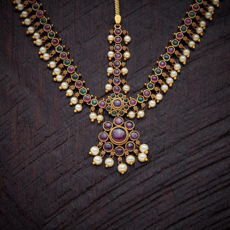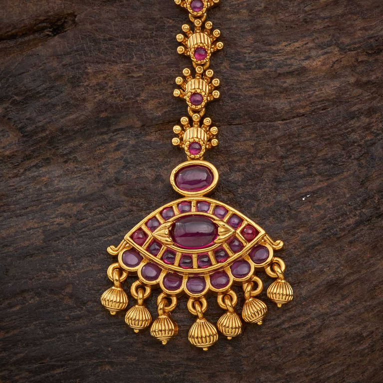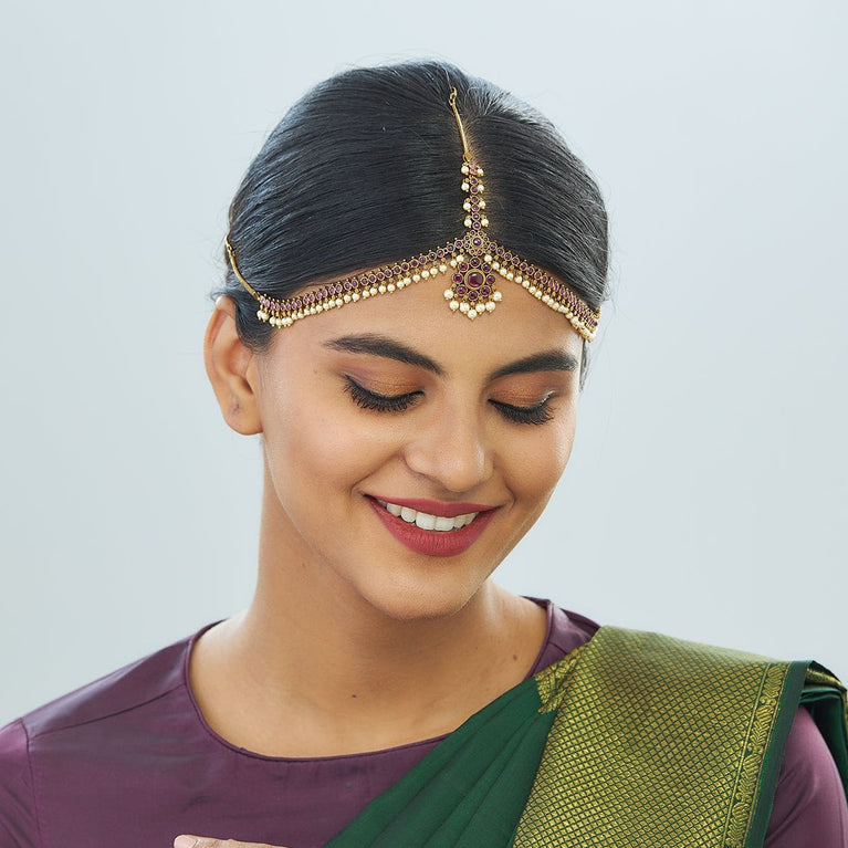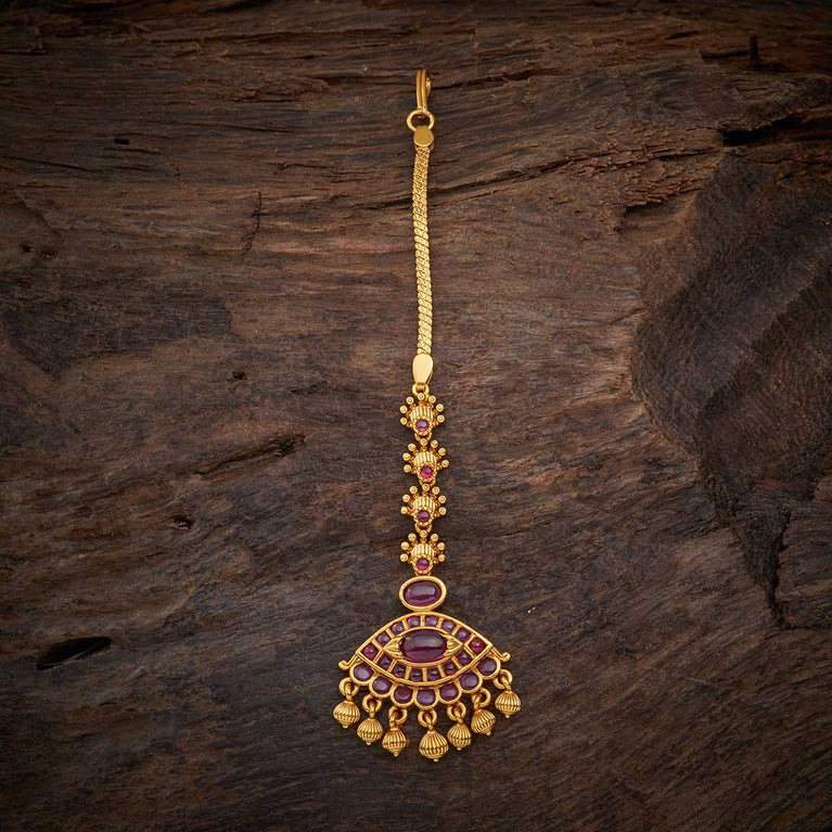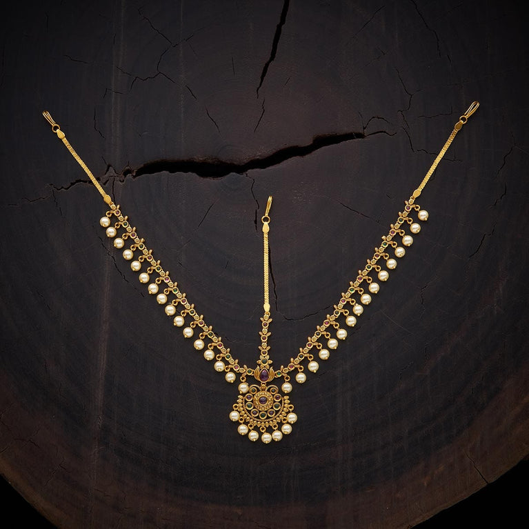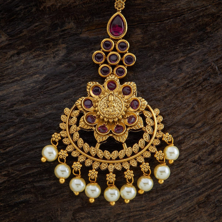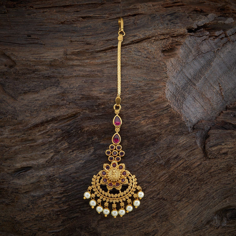 Kushal's Fashion Jewellery Flower Motif Antique TikkaLooking for some beautiful hair accessories for a traditional event? This antique Tikka is a perfect piece to add to your traditional look. The floral carving and tiny leaf design embellished with Ruby stones and hanging pearls are alluring enough for a stunning presence. Style it with loose hair or any other hairstyle and impress everyone on this festive occasion.