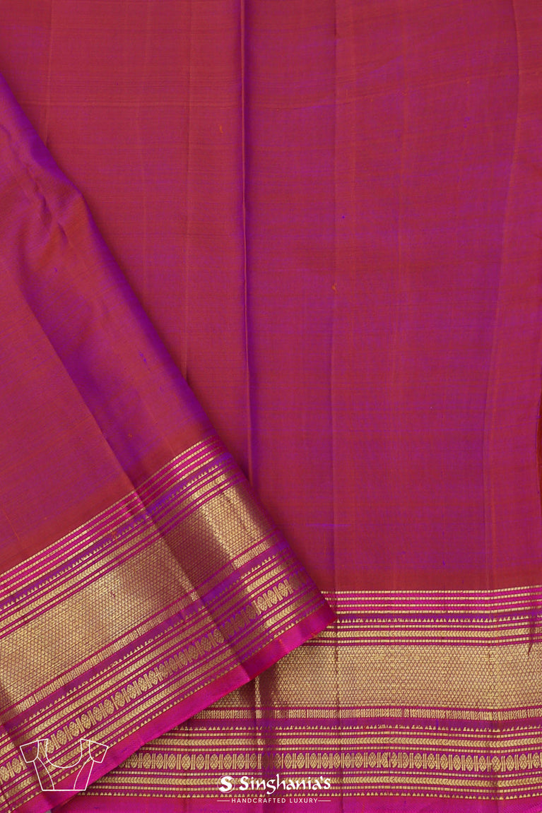 A dark violet kanjivaram silk saree where the body features delicate floral buttas in antique gold zari, complemented by a rich pallu displaying classical temple and peacock motifs. The contrasting pink border adds a fresh dimension to this timeless piece.